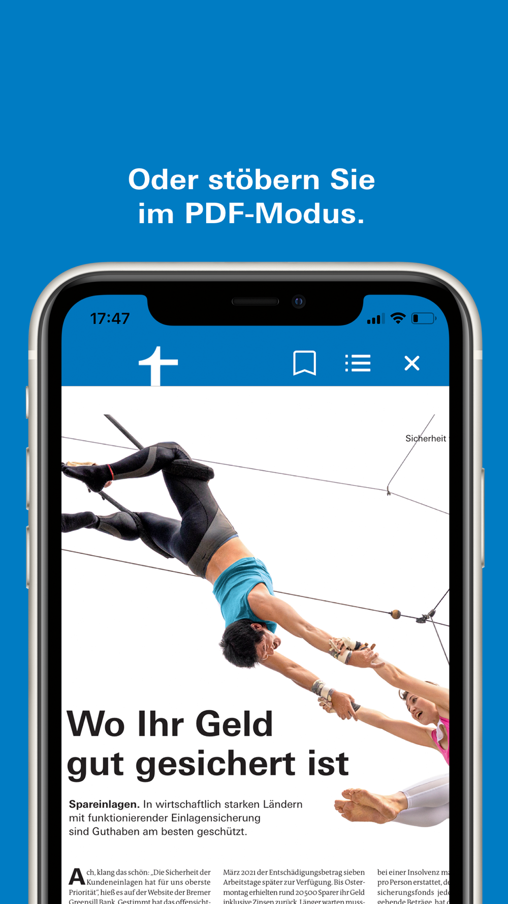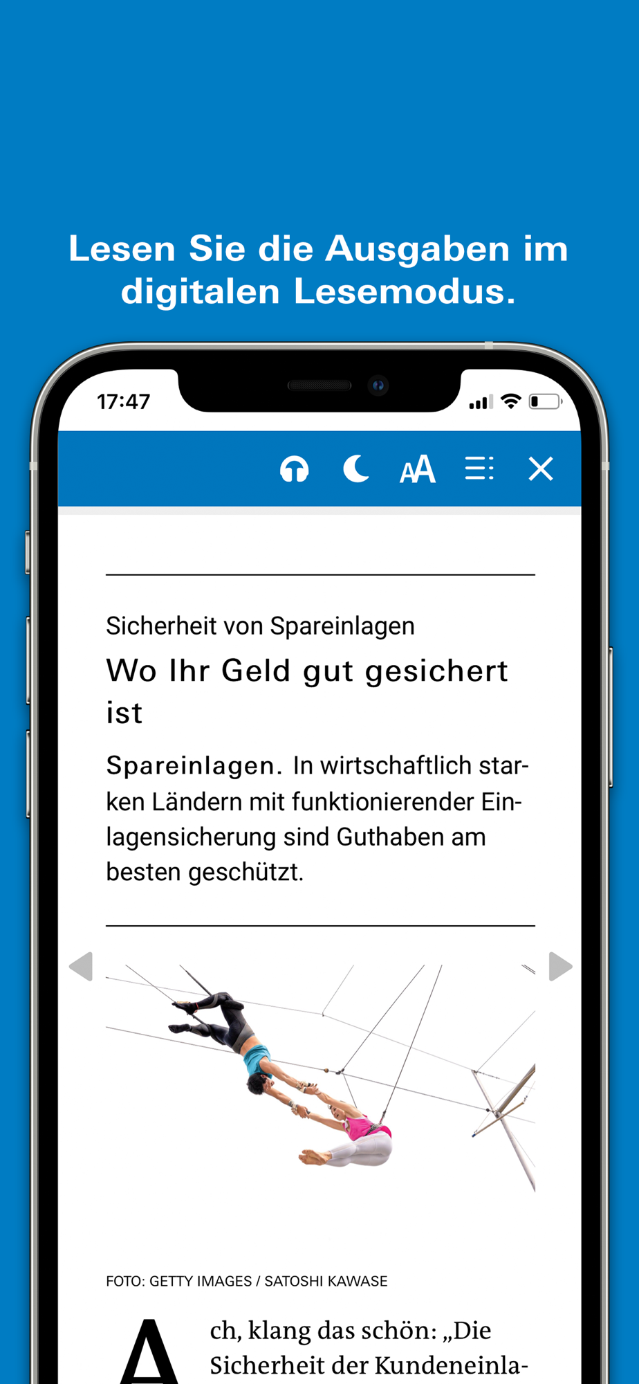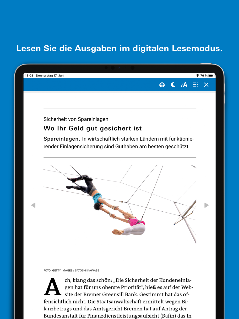 Der digitale Lesemodus mit Bildern passt sich der Bildschirmgröße Ihres Geräts optimal an. Dies ermöglich auch ein komfortables Lesen auf kleineren Endgeräten wie Smartphones. Sie öffnen den digitalen Lesemodus durch ein Tippen auf den Artikel im PDF-Modus. Der digitale Lesemodus bietet eine Reihe von Optionen, die weiter unten beschrieben werden.
