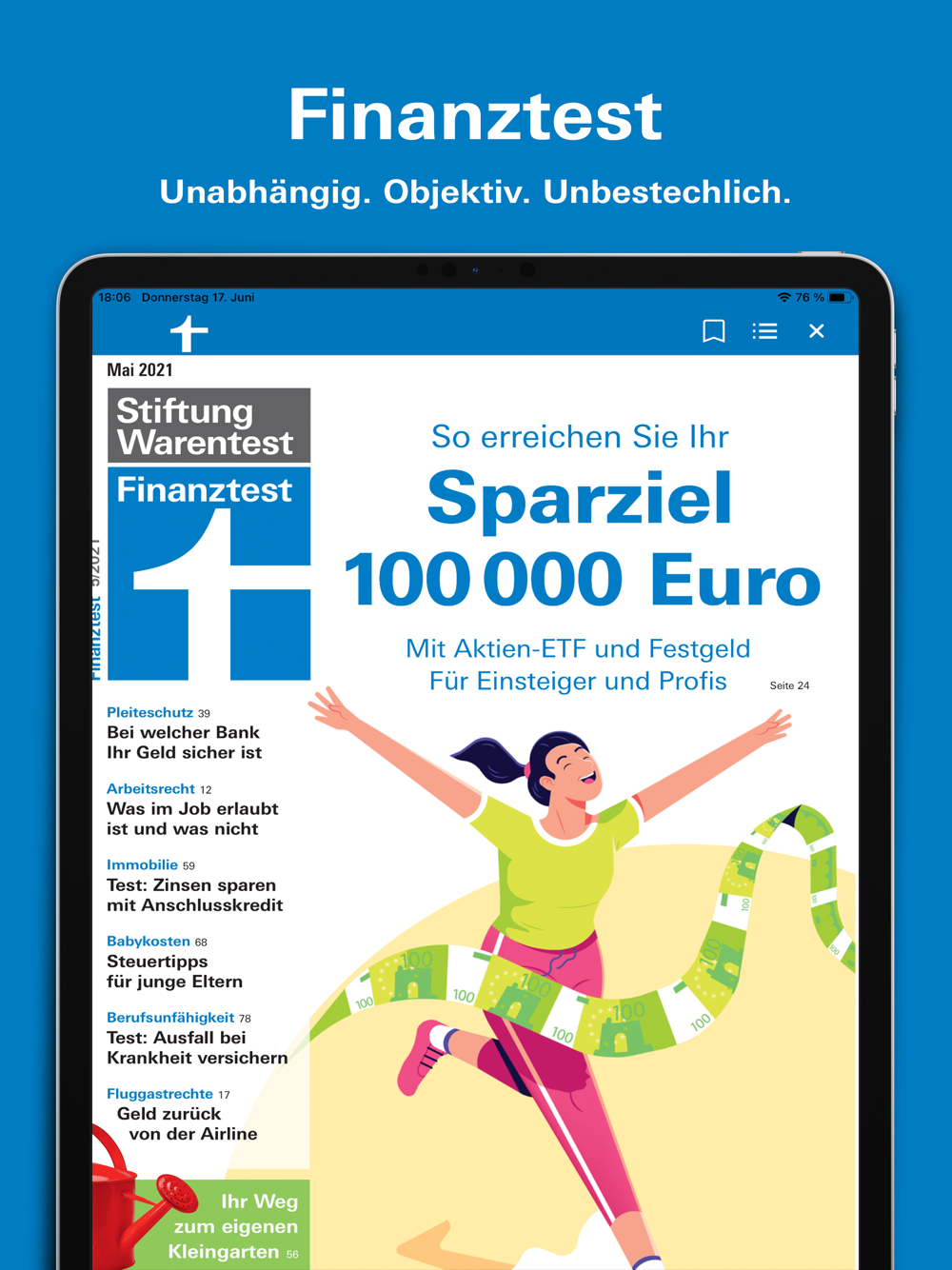 Finanztest hilft mit Tests und Tipps leicht verständlich in allen Geld- und Rechtsfragen. Lesen Sie die kompletten aktuellen Ausgaben des Verbrauchermagazins Finanztest der Stiftung Warentest auf Ihrem iPad oder iPhone.