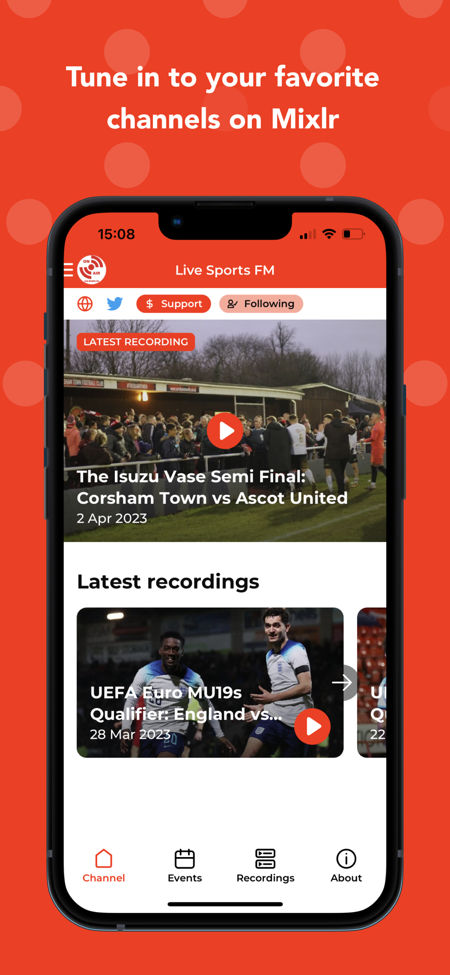 Follow your favorite channels and get notified when an event is going live. Be active in the community and chat with other listeners, or simply sit back and listen to the live stream. Scroll through a channel’s recordings collection and play back recordings to your heart’s content. Finally, search for more channels to follow and love.