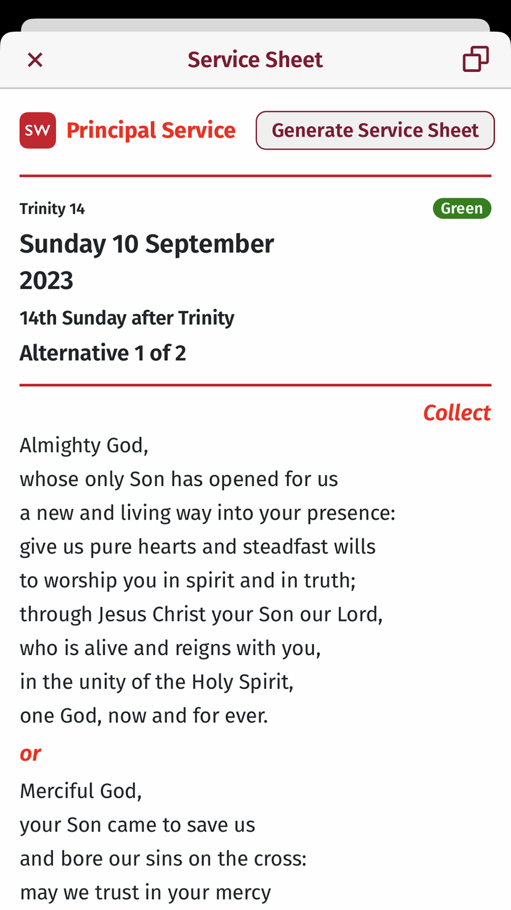 - Access the Collect and Post-Communions for the day at the touch of a button.