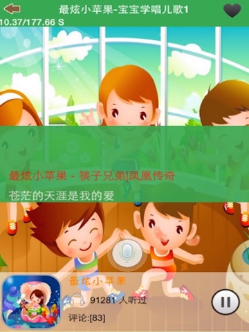 亲子儿歌100首,为宝宝学唱儿歌系列作品, 让爸爸妈妈跟宝宝一起同唱那些让人耳熟能详的儿歌, 并且通过学唱k歌记录宝宝儿时的声音, 留作后续记忆, 值得留念。它能增强与宝宝之间的互动, 同时增进家庭感情, 培养宝宝情商和智商。宝宝学唱儿歌也能让爸爸妈妈想起小时候难忘的时光, 唤起童心, 改善心情。这是一款很好的亲子应用, 同时也是一款能抒发心情的娱乐应用。