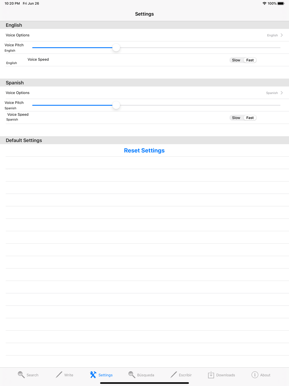 - Set the voice speed to listen words slowly or fast for both English and Spanish.