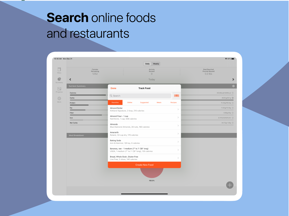 • Group ingredients into meals or recipes and easily log one or more servings.