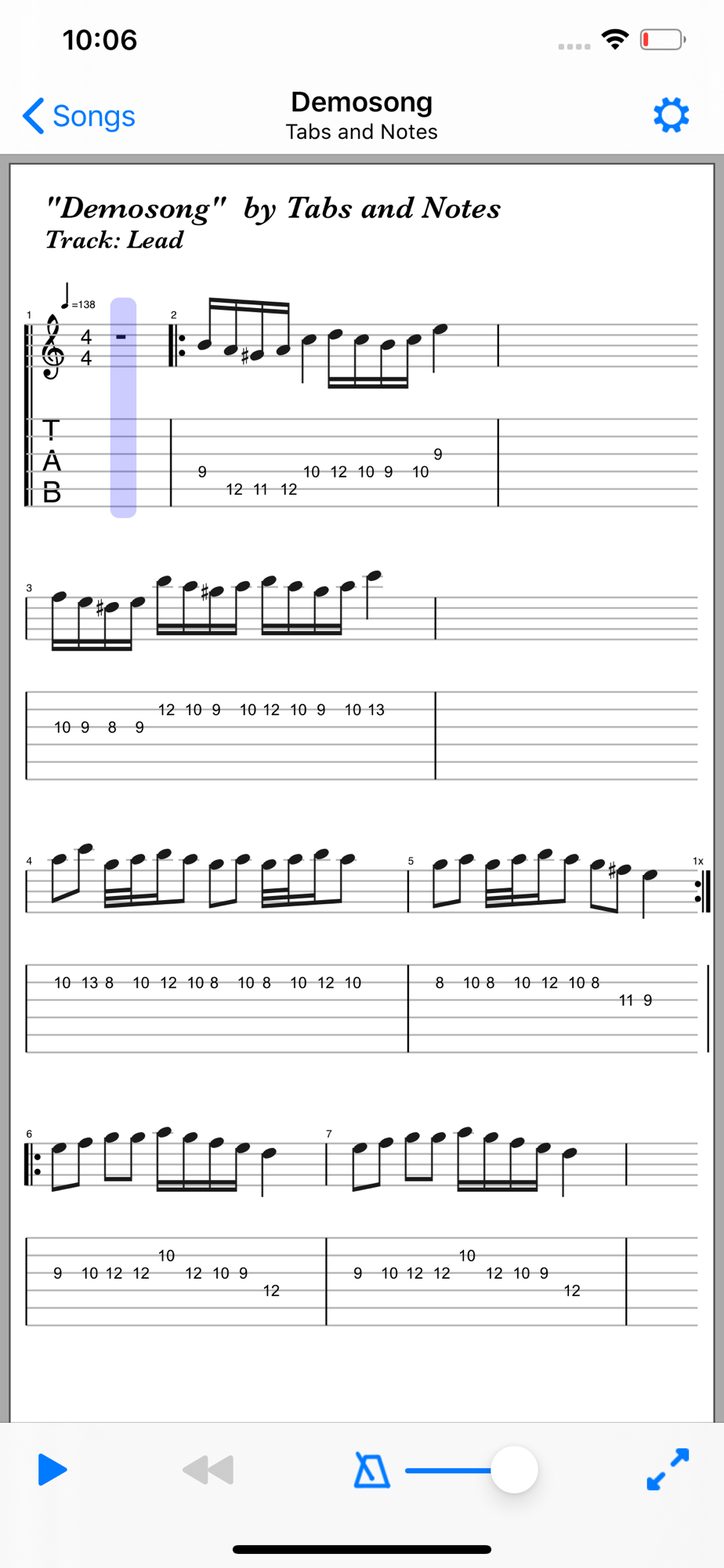 Tabs & Notes displays and plays your song tablature and notes.