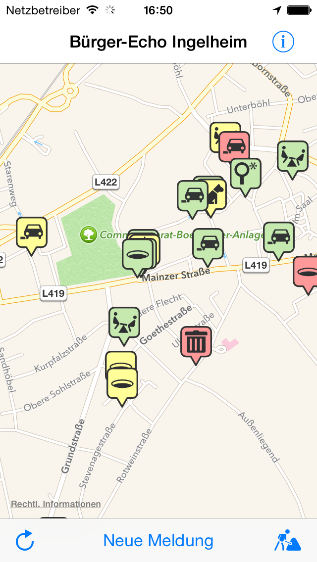 Ingelheim ist bereits jetzt eine lebens- und liebenswerte Stadt, doch es gibt nichts, was man nicht noch verbessern könnte. Teilen Sie uns mit dieser App Ihre Beobachtungen mit, wir werden versuchen, den Schaden schnellstmöglich zu beseitigen und unsere Stadt so sauber und intakt wie möglich zu halten.