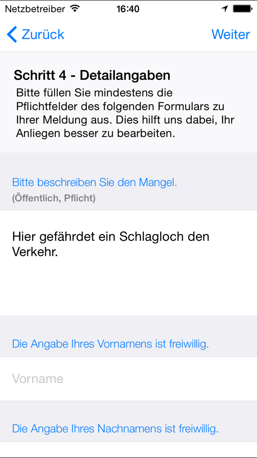- Geben Sie den Ort und eine Beschreibung des Schadens an