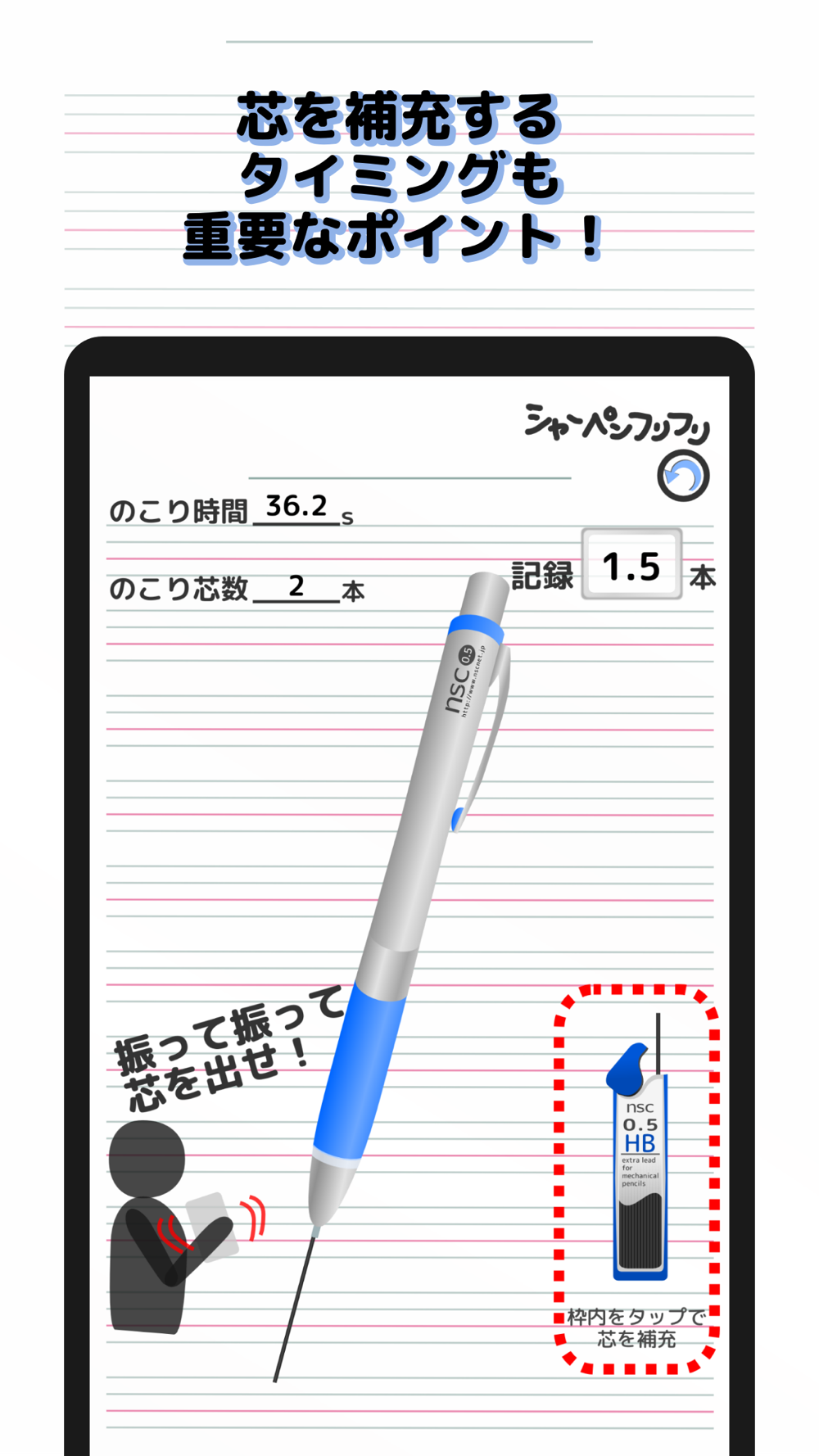 補充は芯の残り本数に関係無くタップする事が出来ます。ただしその際、1秒間のロスが発生しますので、より少ない補充回数でゲームを終了させることが重要となっています。