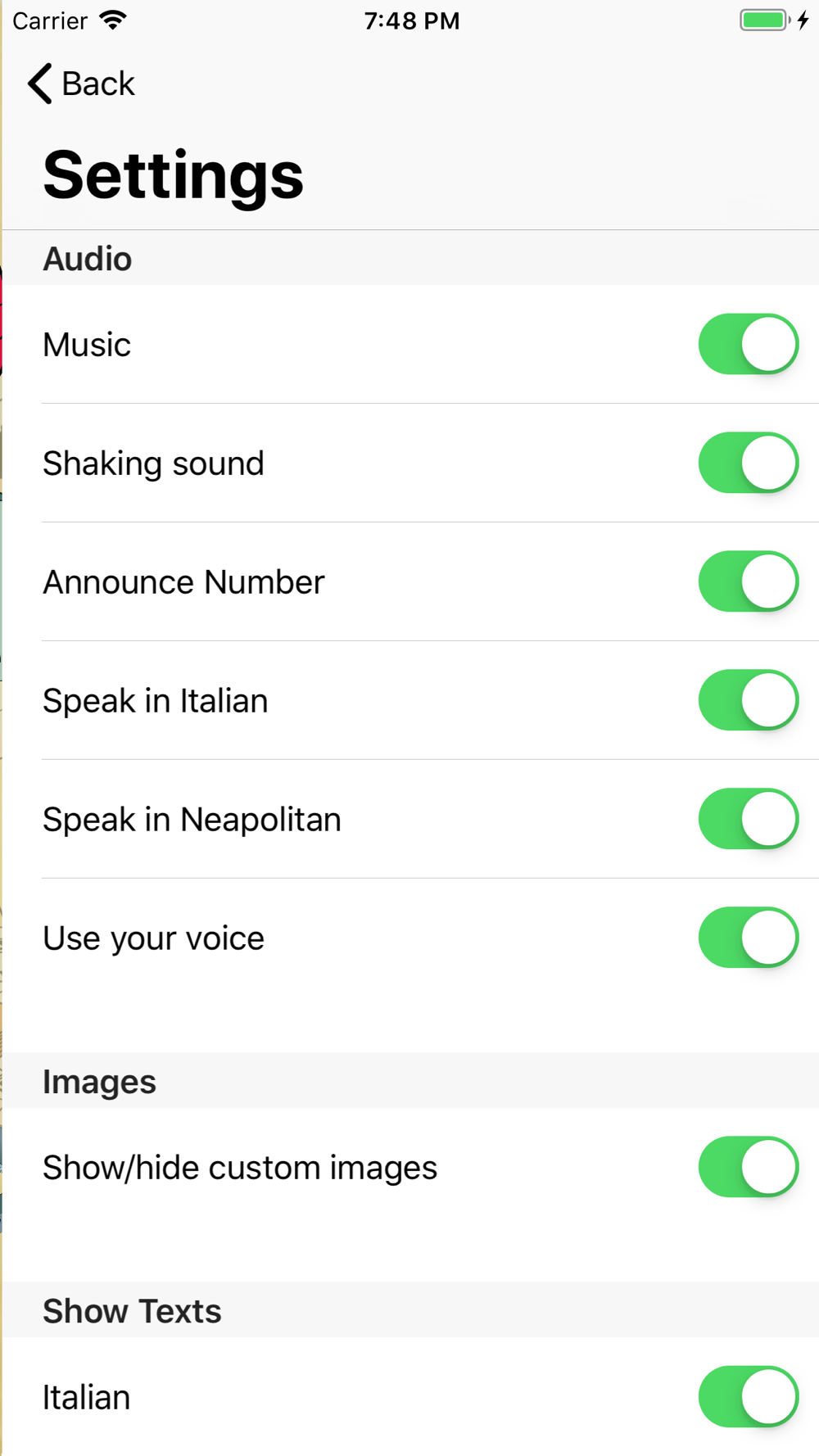 TEXTS: You can assign a custom text to grimace numbers, and choose whether to display text during the game in Italian, in Neapolitan, in English, your personal text, or any combination of these four.