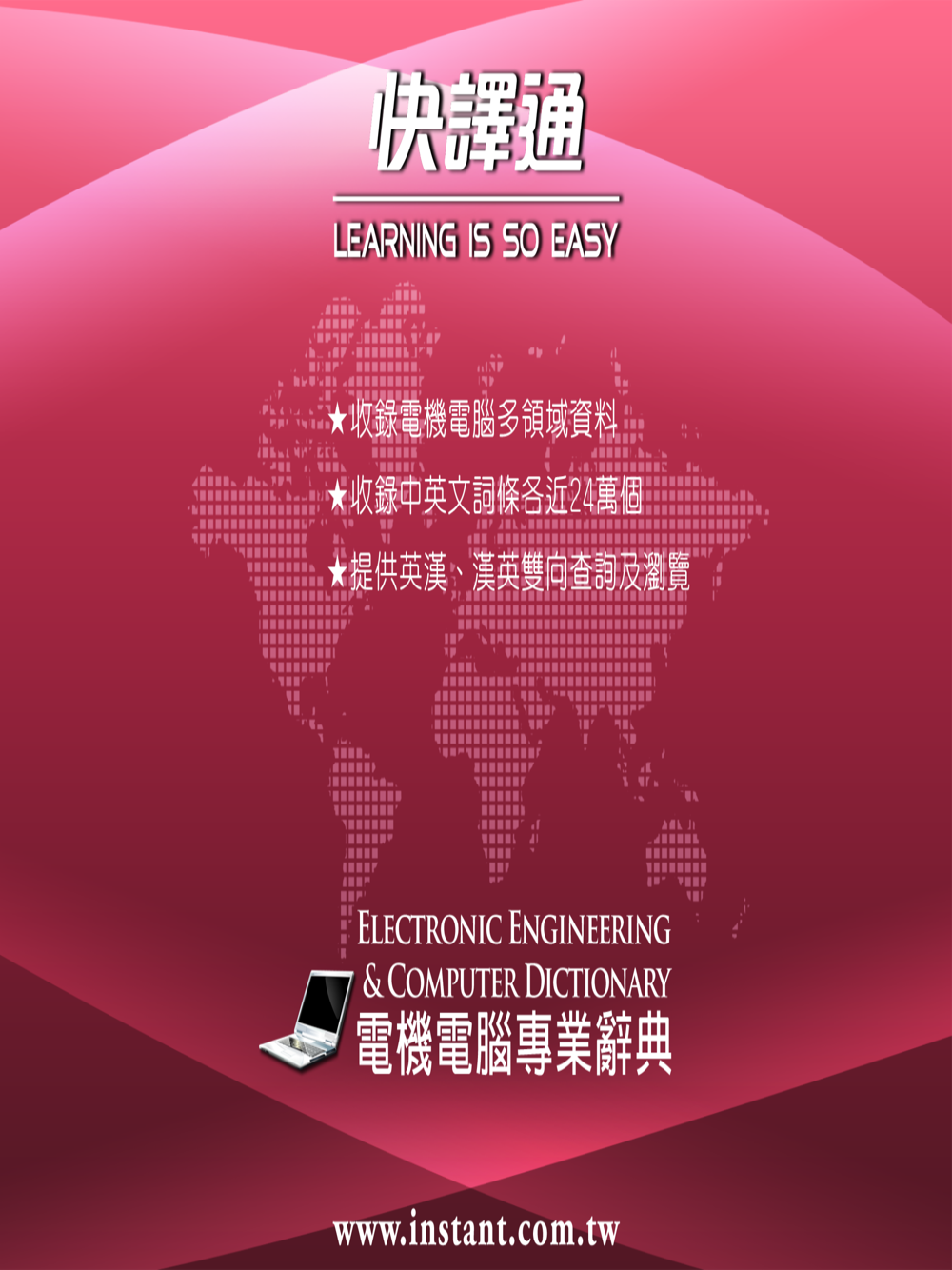 【快譯通電機電腦專業辭典】結合電機電腦領域資料,收錄電子專業、電子電機、電腦專業、網路專業、機械專業等專業辭典,超大量詞彙、搭配清晰發音、操作簡單明瞭,讓您一用就上手。