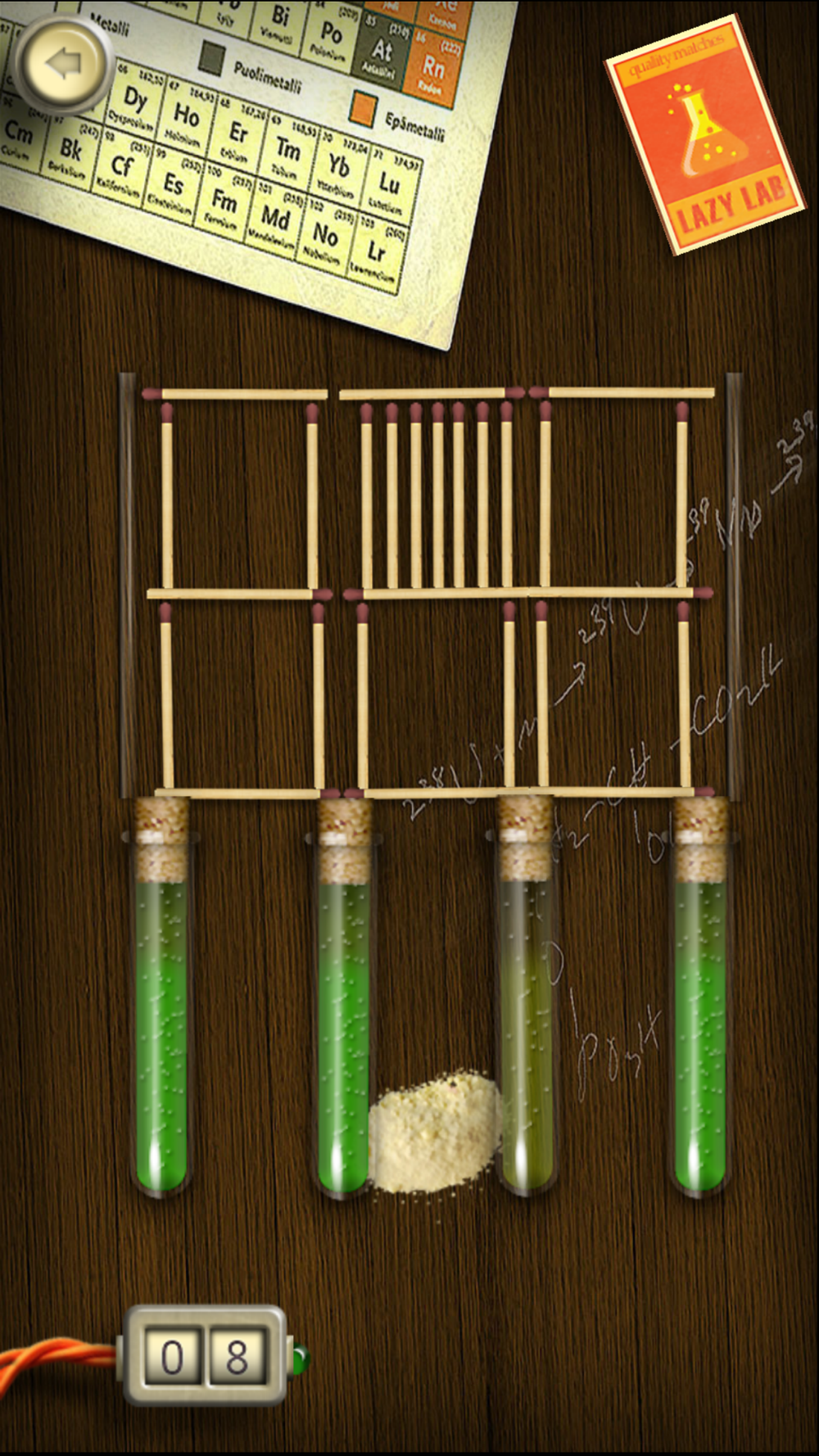Drag a match to the matchbox and see how the structure collapses. Try to figure out how you can make as many matches fall all the way down as possible. Look out for pencils, bugs, bullets and other obstacles.
