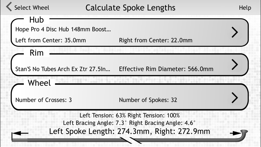 Multiple measurement and entry method. For example hub flange spacing can be entered as distance from locknut or from center. Rims can be specified by ERD or circumference and spoke bed depth. Specialty fields like offset spoke holes, and custom hub spoke hole sizes.