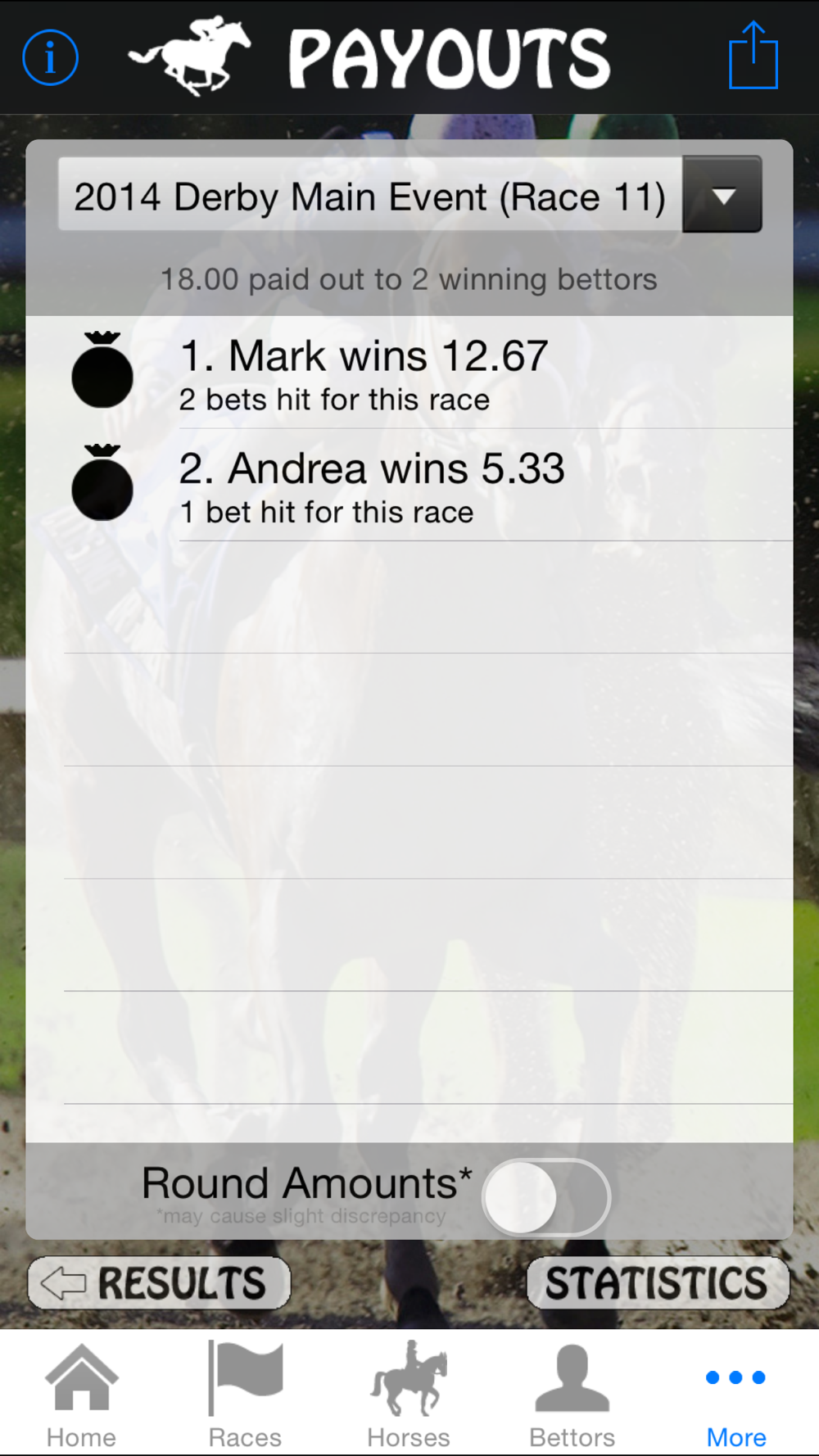 If you are throwing a Derby Party*, or any horse racing based fundraiser or event where you want to accept bets and calculate winners, this is the App to use. Download common race data with horses and odds from the Internet, or enter your own race. Specify an optional house cut for a fundraiser or to cover your party. Add or modify horses and their odds, or mark a horse as scratched. Add or import bettors with an optional email address for distributing a payout summary. Bet types supported are: Win, Place, Show, Across the Board, Exacta, Trifecta, Exacta Boxed and Trifecta Boxed. Once the race has completed, enter the race results and calculate your payouts. The payout summary will specify all winning bettors with their payouts, as well as any fundraising house cut. Keep the calculations and data entry as simple as possible, and enjoy your Derby Party!
