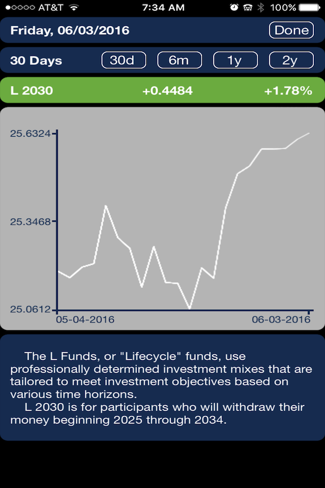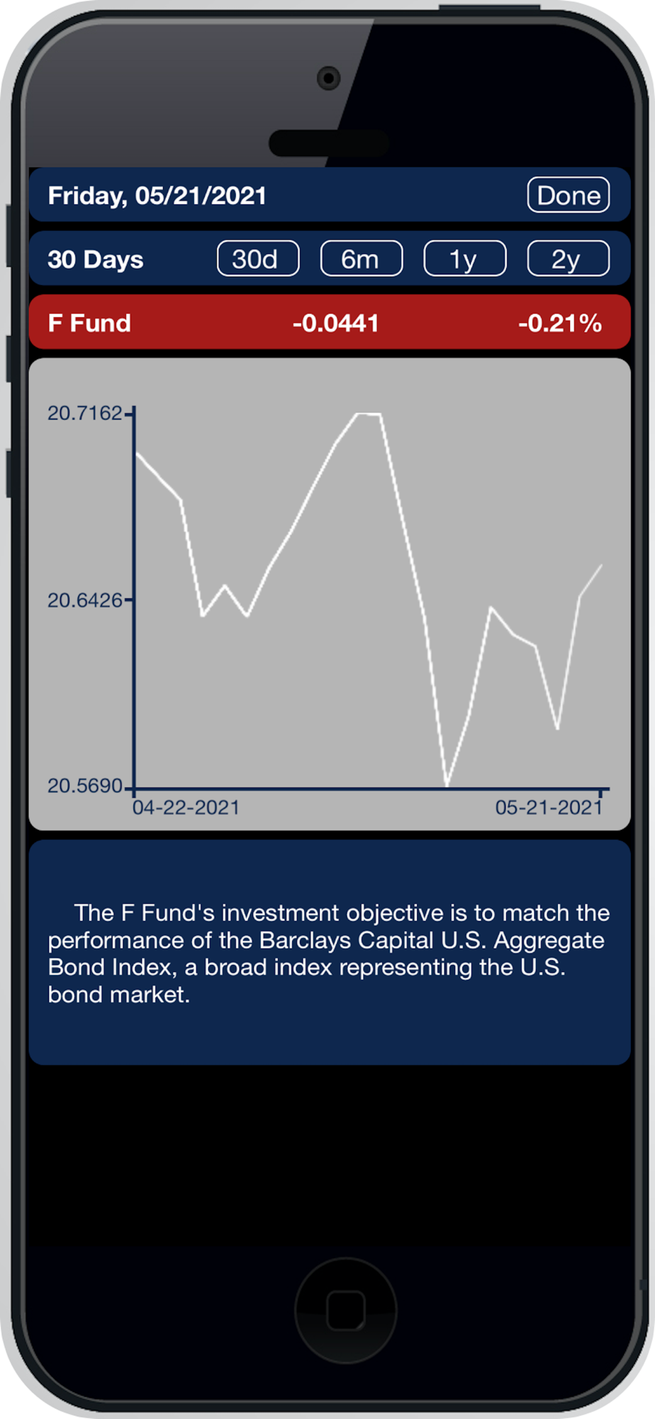 Federal Government Thrift Savings Plan (TSP) fund performance data at your fingertips. You have immediate access to the closing share price data along with the price change and percent change for all the active TSP funds. Select a fund to see its 30-day, 6-month, 1-year, and 2-year fund performance graph. Not all TSP funds track synonymous with the stock market so this gives you direct fund performance where your investments lie.