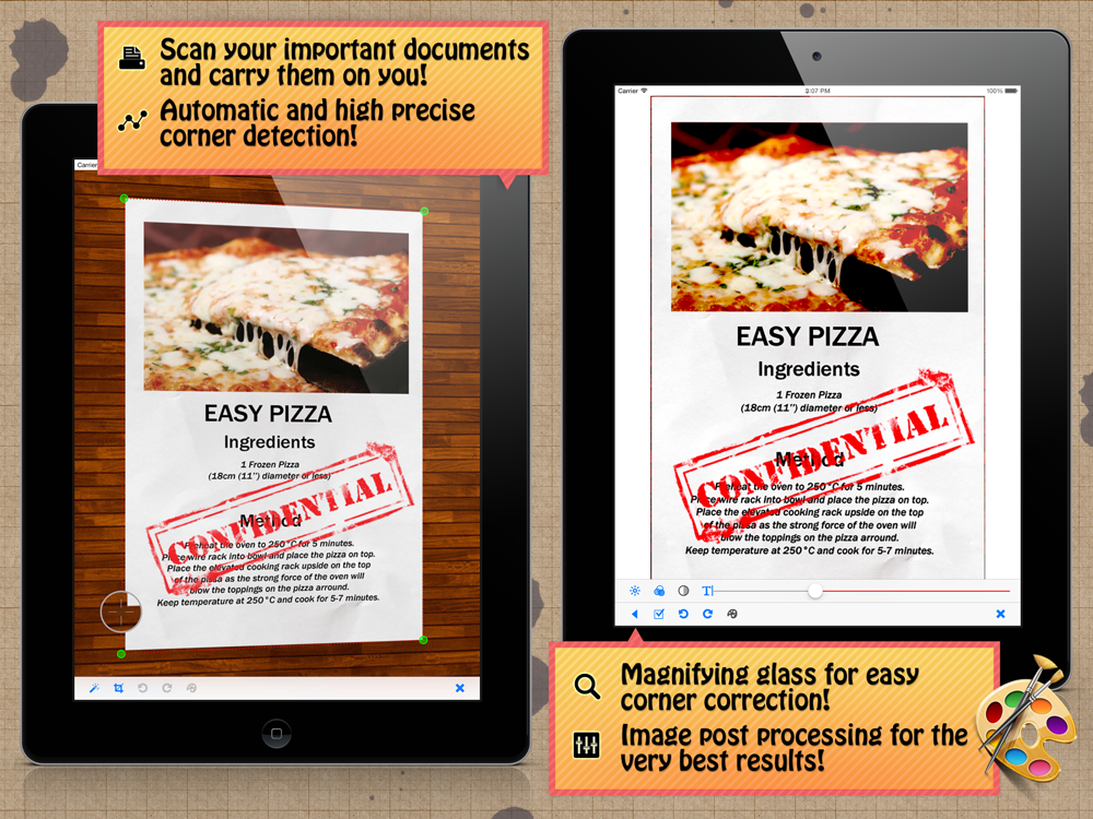 It has never been easier to scan documents without an extra hardware device. Just make a picture of your document, the application does the rest! An advanced algorithm will automatically detect the corners and remove any distortion. You end up with a perfect scan in no time!
