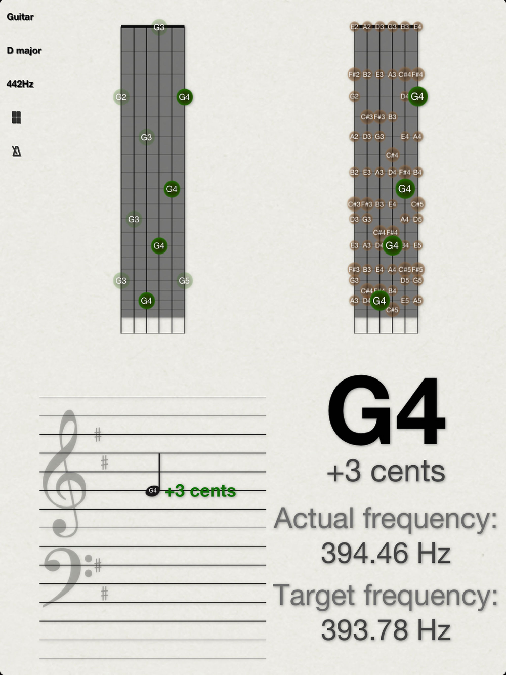 + Circle of fifths and intervals where the last two identified notes are presented in the circle of fifths as well as in the note sheet (with interval size in cents).