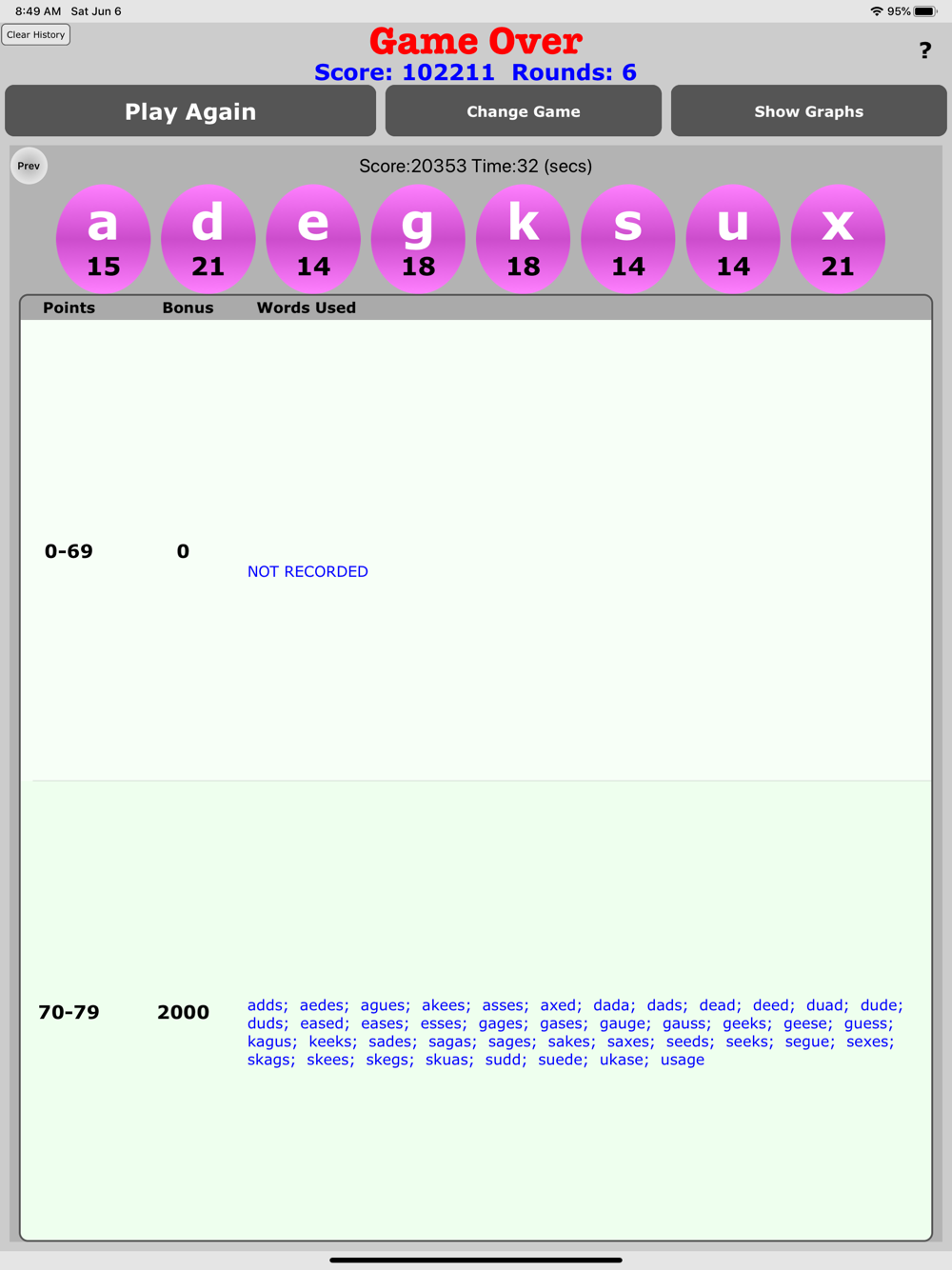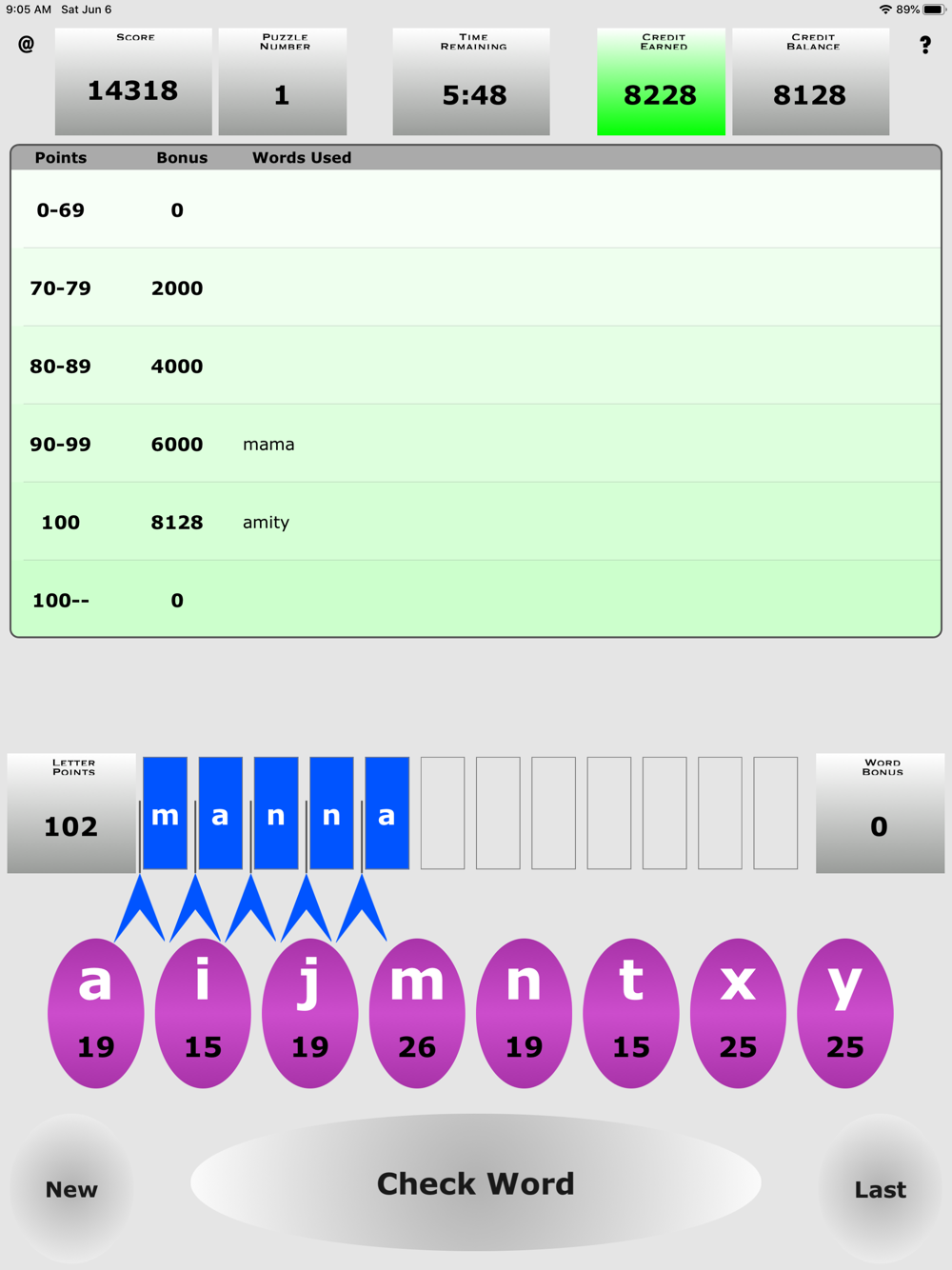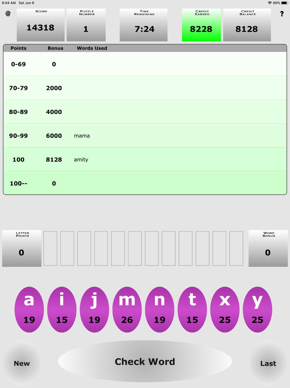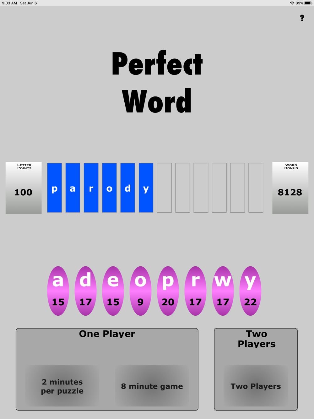 Perfect Word is a challenging game for one or two players in which the objective is to accumulate score by building words form from letter puzzles. A puzzle consists of eight letters with point values. Each valid word found in a puzzle earns the sum of the point values of each letter and a bonus based on how close the word is to perfect. Finding valid words in a puzzle usually easy; finding perfect words is hard.