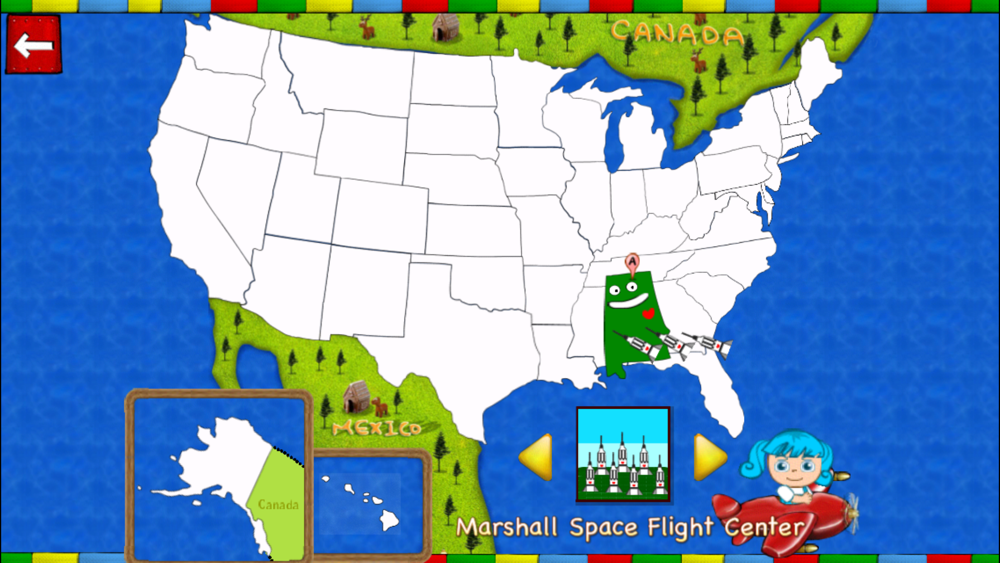 - State: All 50 states animated. Choose to play Easy, quiz, or challenge mode. Roxy announces the name of the state aloud, and your child must drag the state to its proper position on the map.