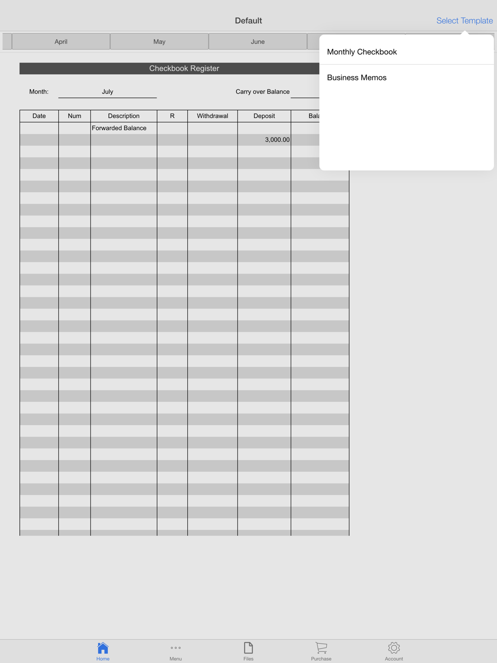 Monthly Check Register app provides you with a simple, intuitive and spreadsheet like interface to help you record income and expenses, develop an aggregate balance, add your important personal, business and medical memos, notes and events.