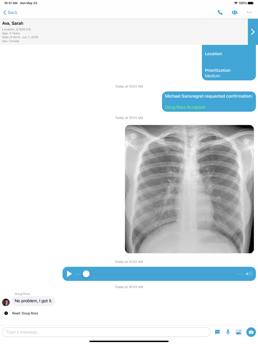 • Unified Communications: Our mobile applications allow for real-time texting and voice communication between clinicians. Multimedia messaging with photos, voice, and attachments are supported as are the ability to record and deliver voicemails when clinicians are busy with patients.