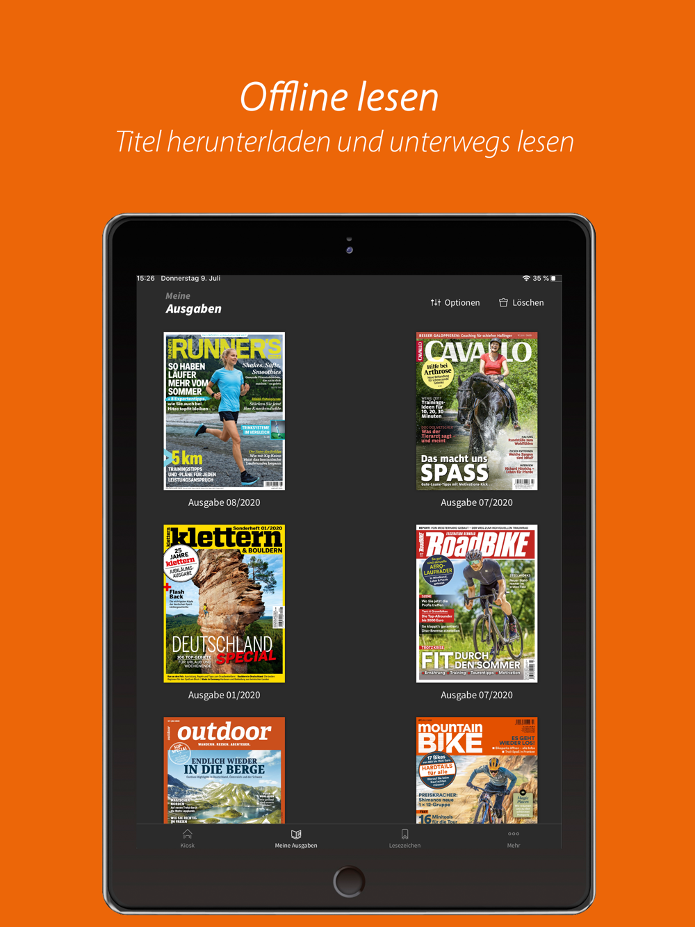 MOUNTAINBIKE, ROADBIKE, outdoor, klettern, RUNNER’S WORLD, CAVALLO, Elektrobike, karl und ADAC Reisemagazin – die ganze Welt des Outdoorsports und der Freizeitplanung als E-Paper in einem Kiosk.