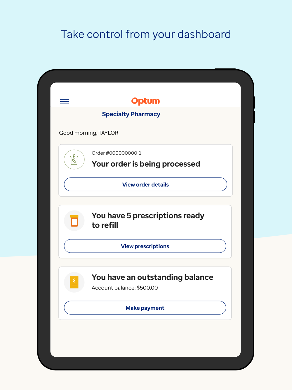The Optum Specialty Pharmacy™ mobile app helps you take control of your prescriptions and treatment, wherever you are. It's there when you need it, whether you're looking for support or have a question about your prescription. With the app, you can save time managing your prescriptions, giving you more time to do the things you love.