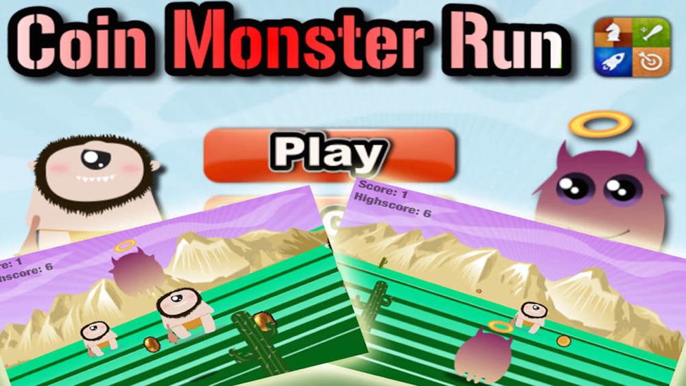 A angel_monster runs toward the mountain. He should avoid to collide the giant One-eyed_ monster and the cactus. Those prickles of cactus and the mace of the One-eyed_ monster will kill the angel_monster. Besides He should also collect more and more gold coins. So, starting running. Don't stop, otherwise the angel_monster will be in danger.