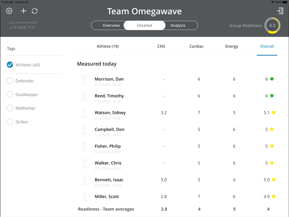 - Omegawave Readiness™ summary for each athlete and for the group as a whole.