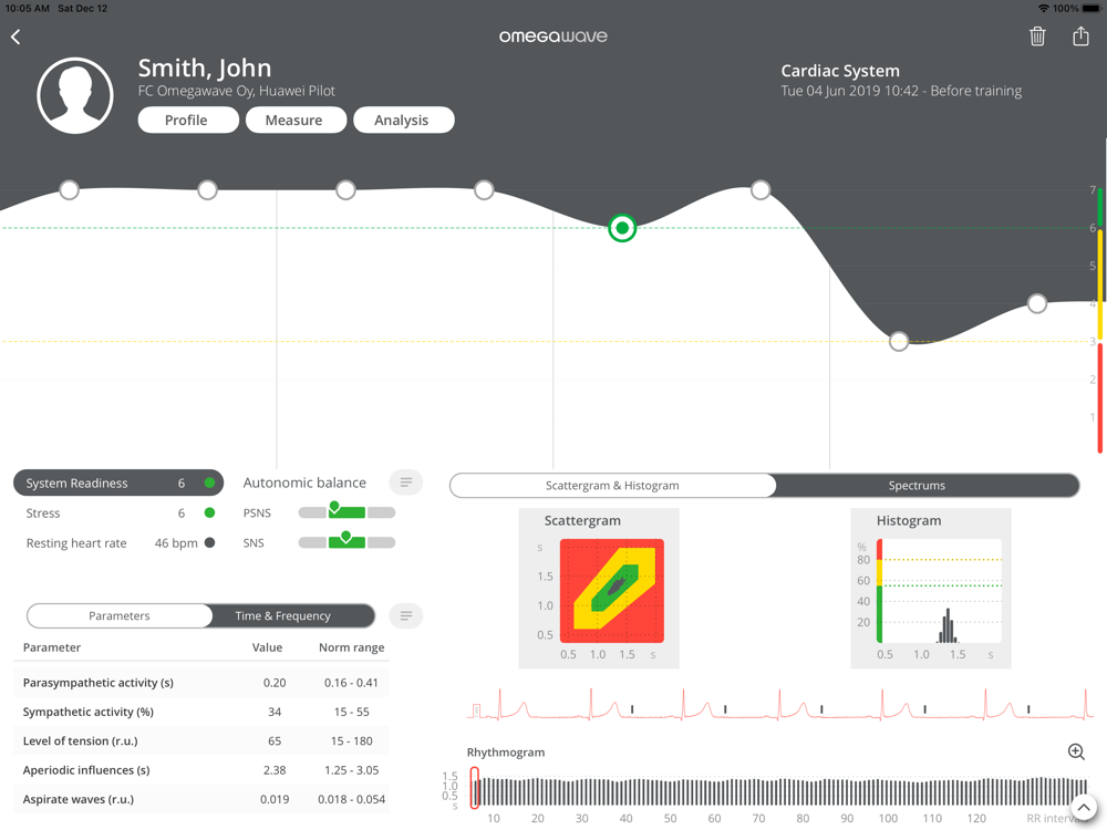 - Detailed reports on the current functional state of the Cardiac, CNS and Energy Supply systems alongside trend-view graphs.