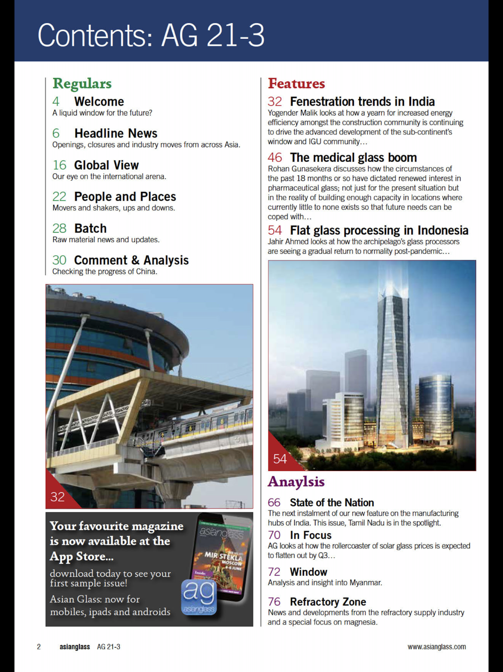 Asian Glass magazine is the leading industry title for the world’s glass industry professionals. With a dedicated focus into market trends, supply and demand and technological developments across all of Asia, the Asian Glass App ensures you are kept fully up to date with the information you need to make strategic decisions with regards to your glass business. Covering the entire continent, from Turkey to China, Asian Glass supplies “must have” market research on a bi-monthly basis, as well as news, views and industry interviews with key leading personnel in Asia’s – and the world’s – glass industries. Whatever your location, the glass manufacturing industries of the Asian continent are having a direct influence on your local and regional industry. Make sure you don’t miss the opportunities that this exciting sector presents, or are caught unawares by the challenges it causes. Download the Asian Glass App and keep yourself informed and at the cutting edge.