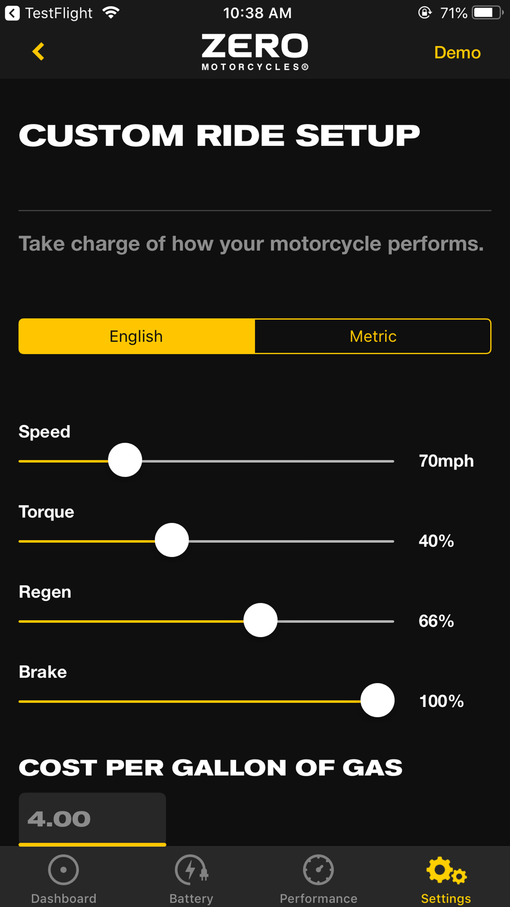 The app utilizes your phone’s Bluetooth connection to communicate with any 2013 model year or later Zero Motorcycles model.