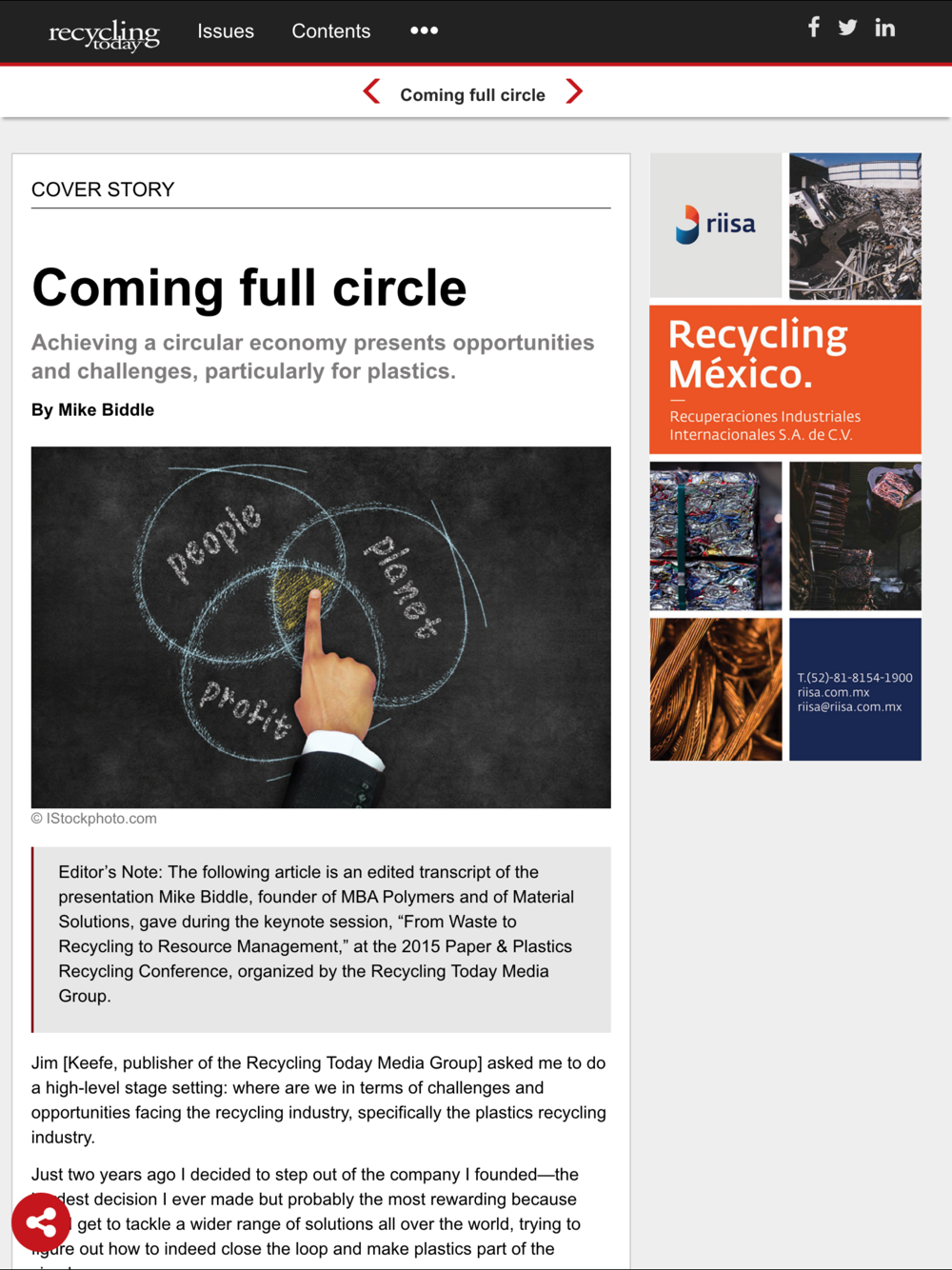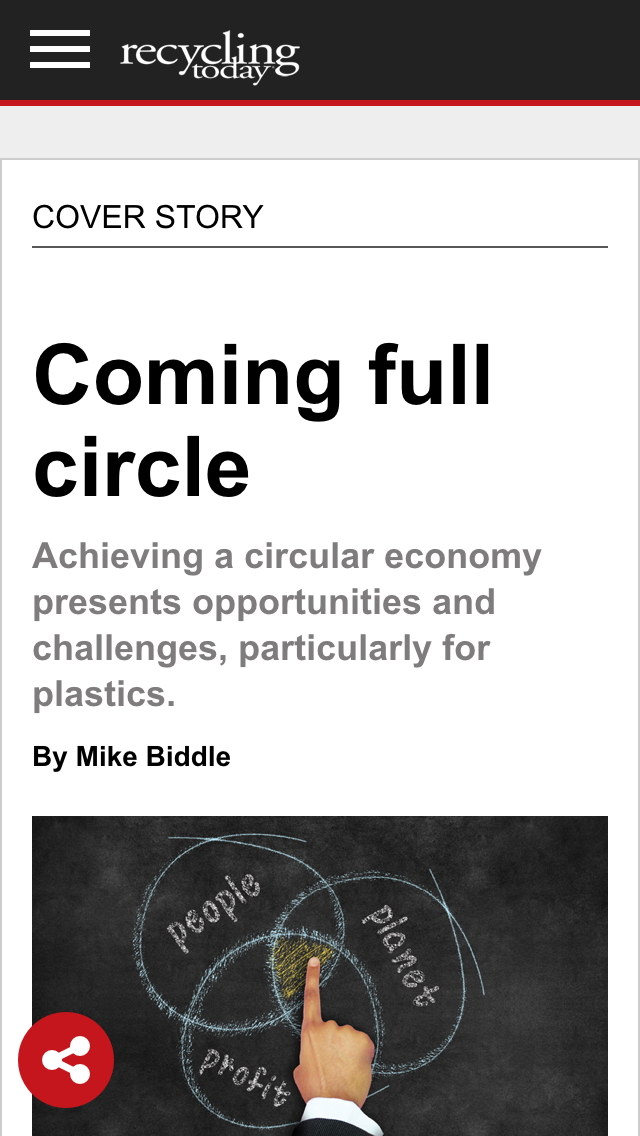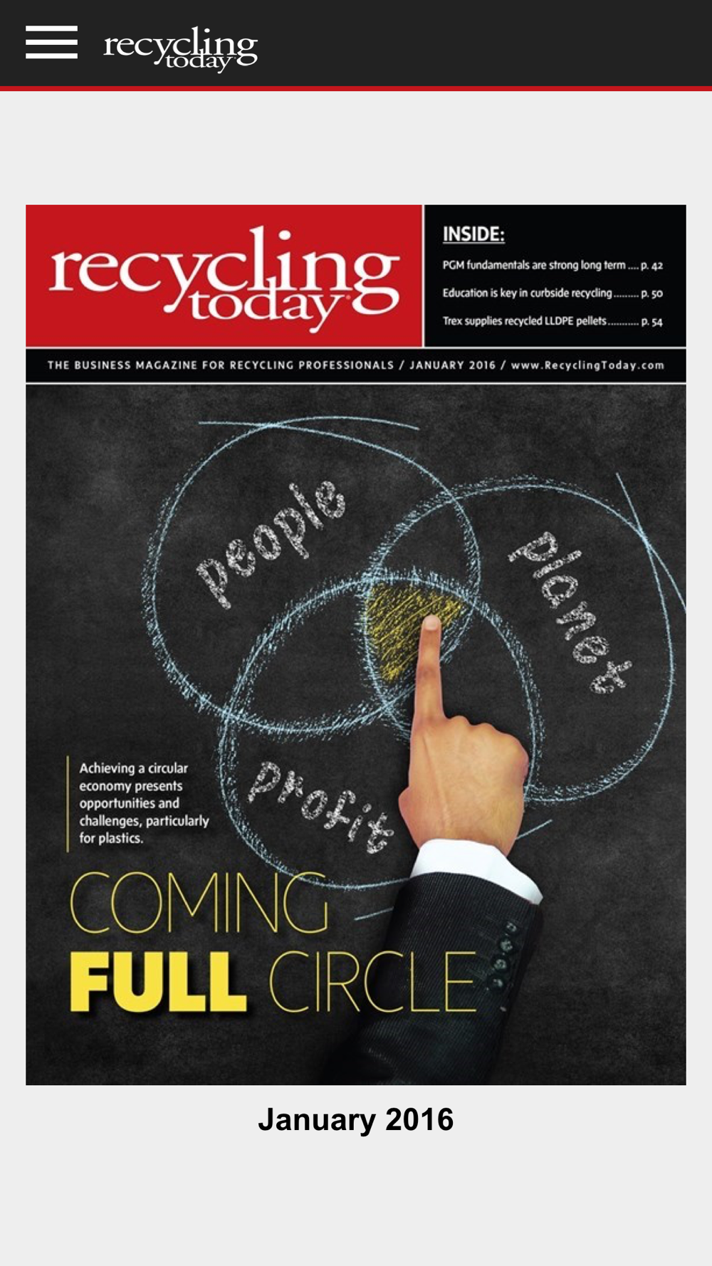 Recycling Today (RT), the flagship magazine of the RTMG, produced monthly provides broad coverage of the recycling industry and offers a depth of market and commodity information along with news, industry developments and company profiles of recyclers.With a weekly newsletter, specialty newsletters targeting the fastest growing segments of the industry and a website that is constantly updated with information, news and tools, RT has a depth of coverage that taps into decades of experience, while also recognizing the continual evolution of the industry.