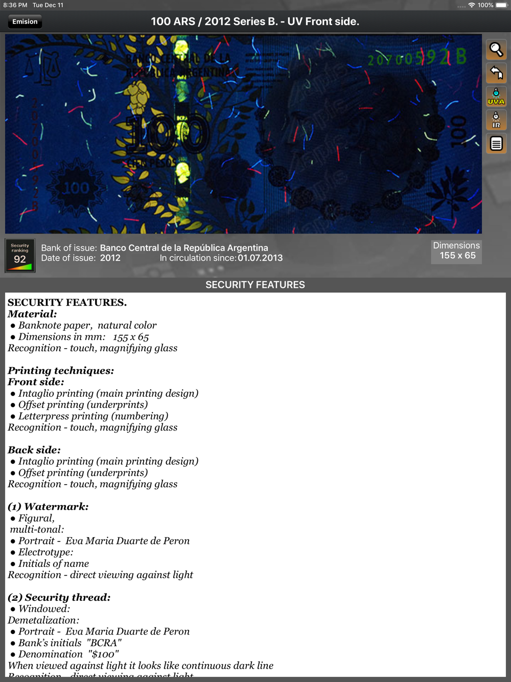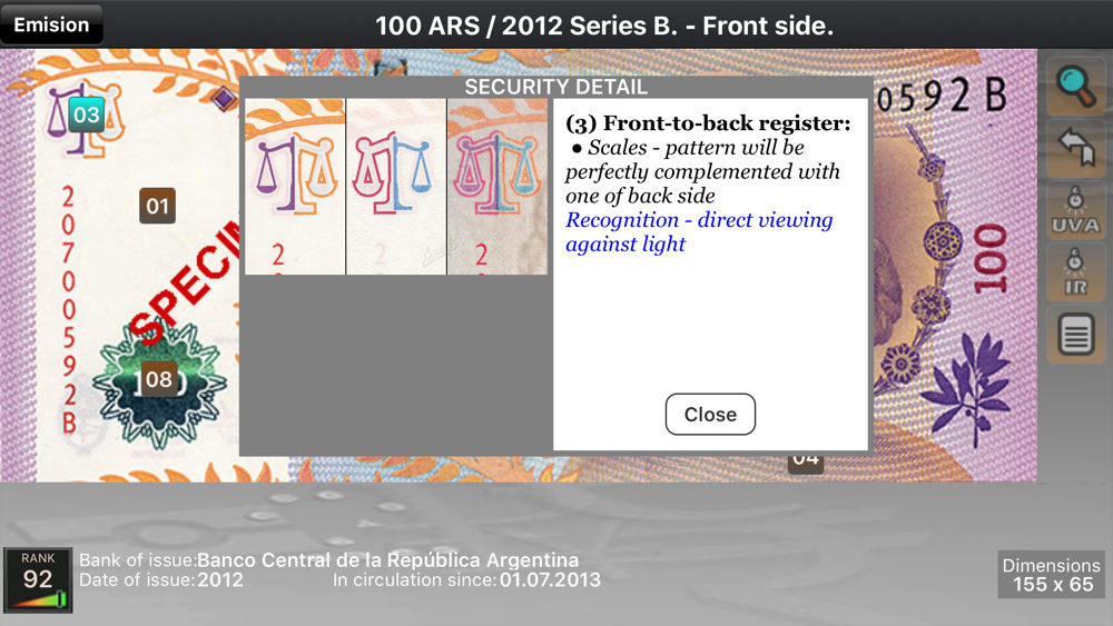 MoneyCheck is an authentication tool that helps you to verify the genuineness and validity of all banknotes in the world. You can become an expert of verifying fake banknotes by using MoneyCheck. It is easy to distinguish genuine banknotes from the fake ones by using easy procedure that is used by professionals. Protect yourself from the possible financial harm forever. This tool will let you find out each security feature of banknote.