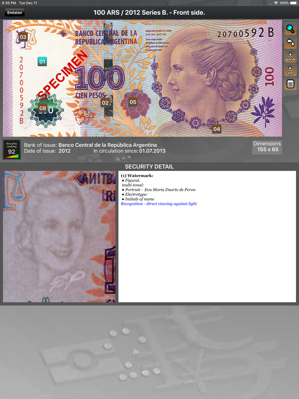 MoneyCheck contains banknotes security information of 25 most frequently used world currencies: USD, EUR, GBP, CHF, DKK, SEK, NOK, RUB, CNY, HKD, INR, JPY, CAD, AUD, NZD, BRL, ARR, CLP, IND, THB, AED, ILS, TRY, MXN, EGP.