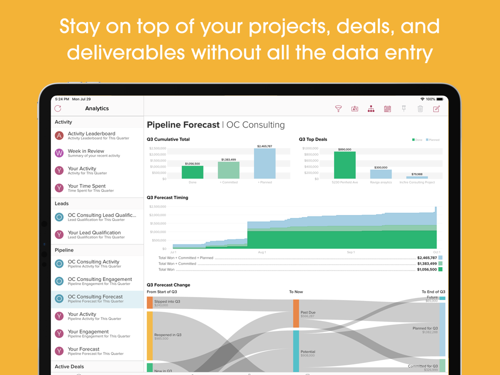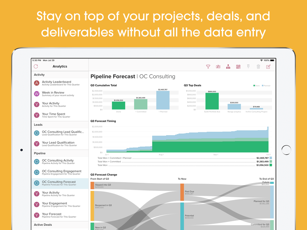 • Analytics: Pipeline, forecast, engagement, activity, and lead analytics