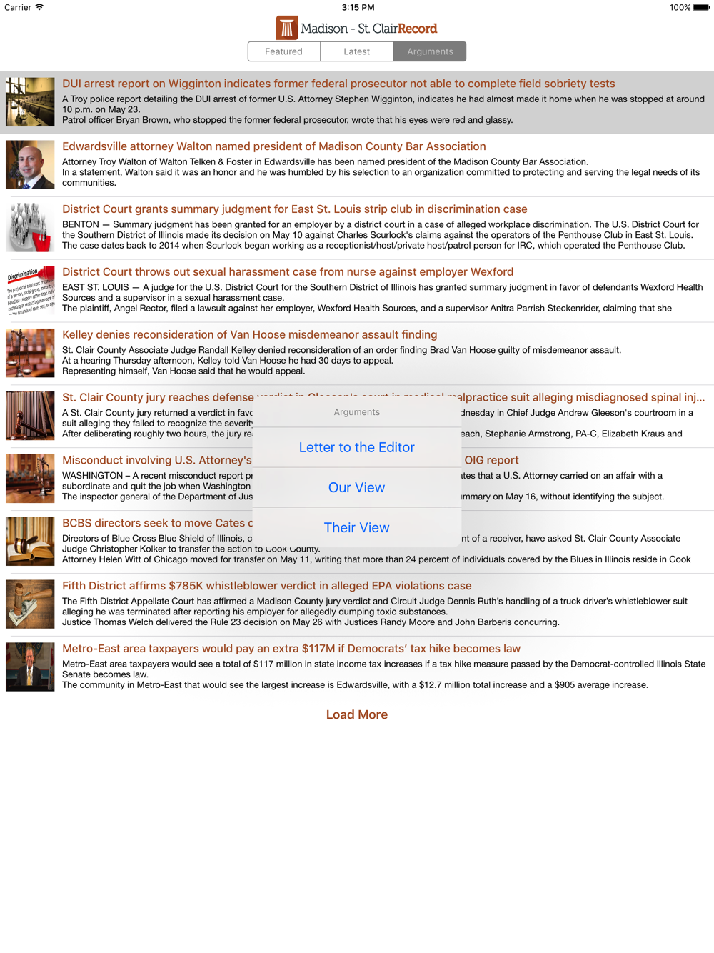 The app allows you to view Stories (Featured, Latest News, Most Popular), Arguments (Our View, Their View, Letters), Dockets (Asbestos, Civil), and Issues.