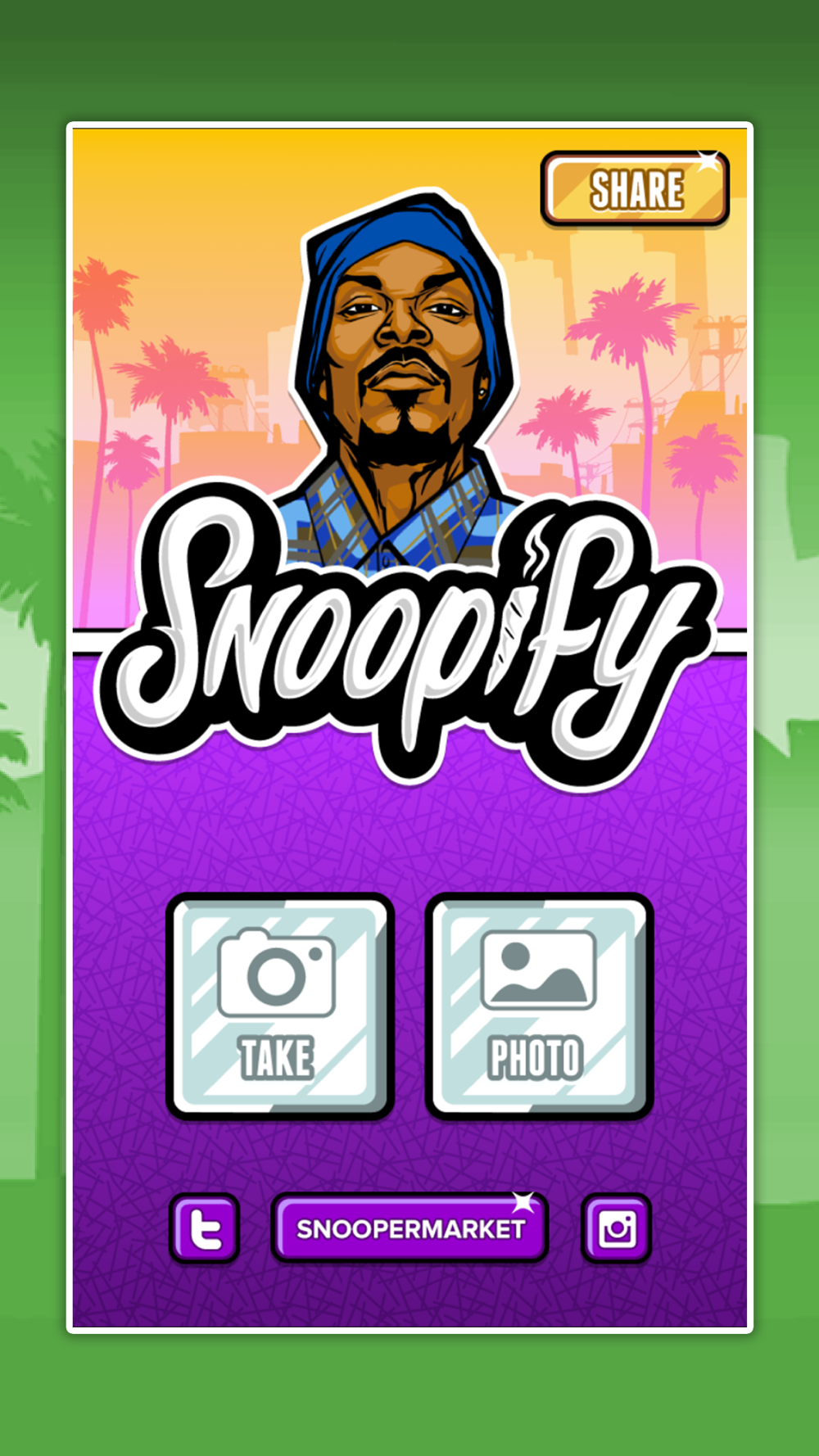 Snoopify allows you to take photos of your friends or environment, and turn them into Snoop-themed masterpieces. Share these unique photos on Facebook, Twitter, and Instagram, or save them to your device and send to your friends and family.