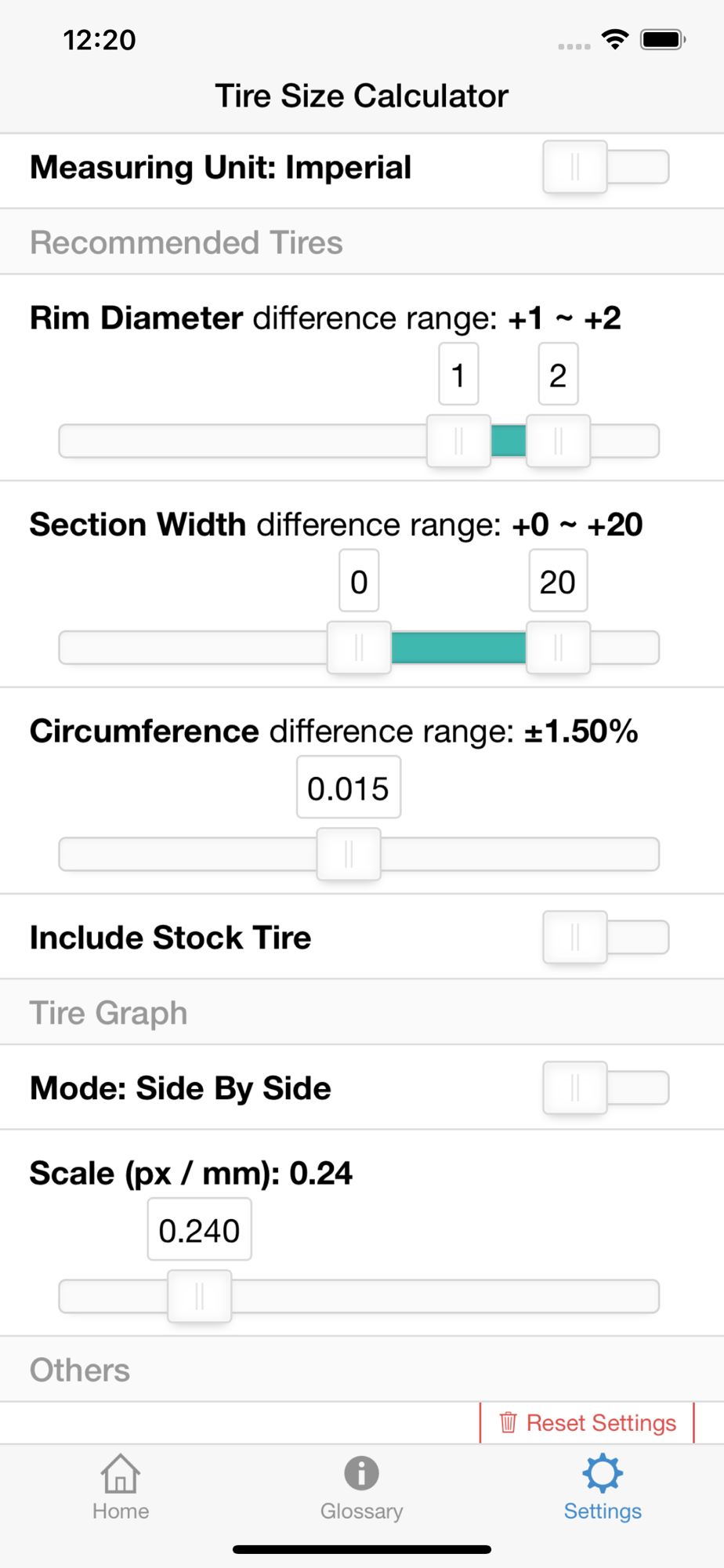 2. Calculate tire sizes, and compare tires with detailed specs, in either Imperial or Metric units. See the visual differences between tires using the scaled tire graph with two display modes: side-by-side as two complete tire circles, or use half of each tire to constitute one tire circle.