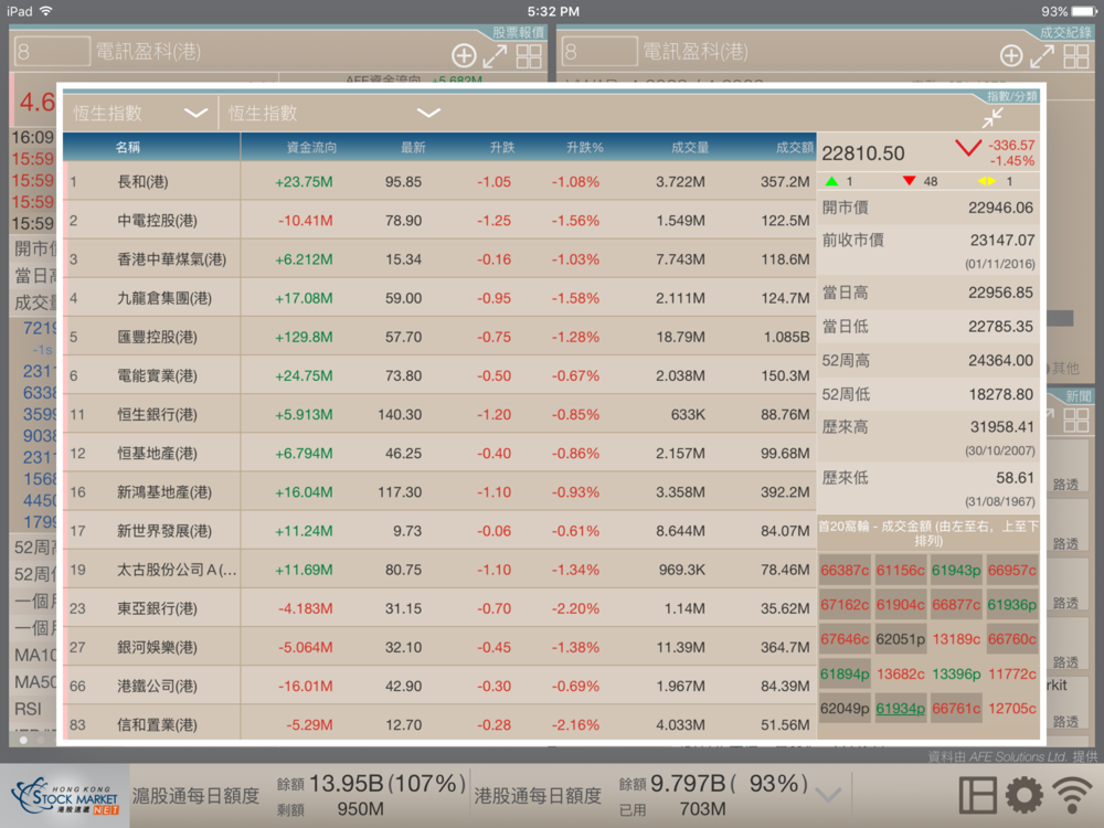 - Comprehensive self-monitoring system for about 90 Constituent Stocks of Hang Seng Index, China Enterprise Index & China-Aff Corp Index.