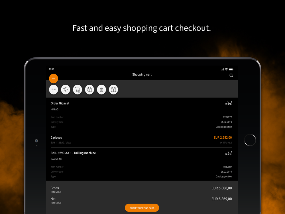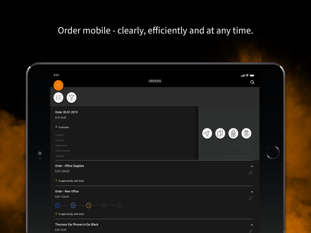 Easily initiate time-critical or time-consuming ordering processes and multi-level approval workflows while on the move. Order ad-hoc products, ranges or services around the clock, exactly where and when you need them: