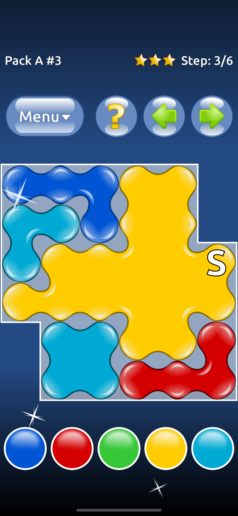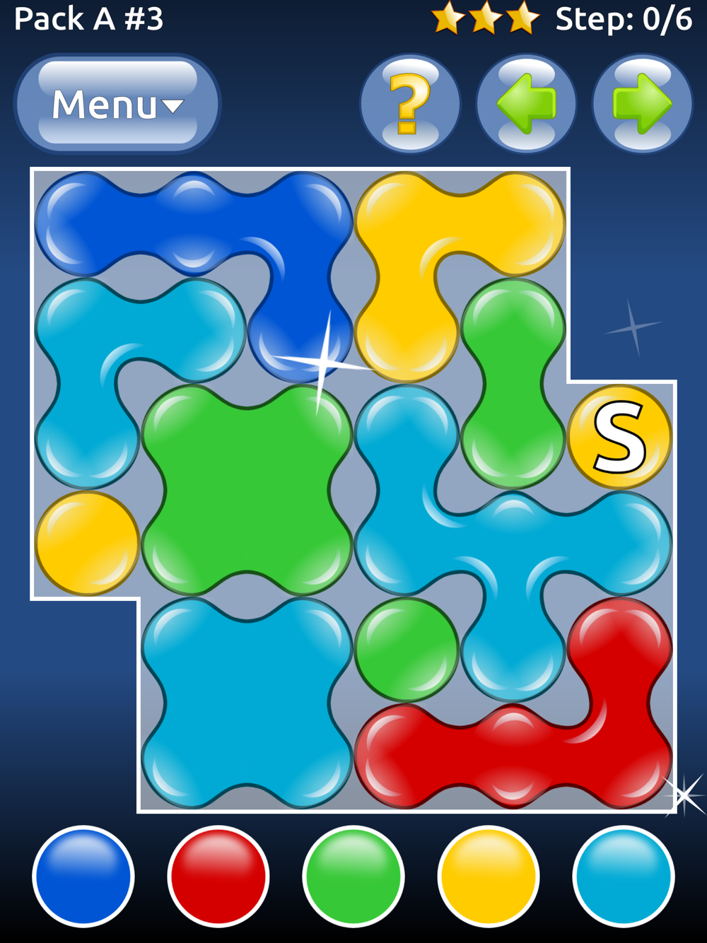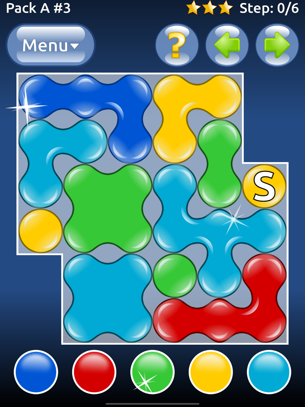 In Color Oil, your task is to fill the board with the same color. The game starts in the cell labeled S. Tap the buttons on the bottom to change the color of cell to match the surrounding cells. Do this repeatedly until all cells are of the same color.