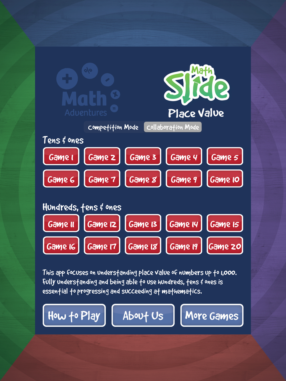 Math Slide is part of our ‘play and learn’ series, which are games high in educational value where children learn as they play. Our apps are research based and classroom tested to make sure they help children learn. We use the power of the iPad and technology to empower teachers and help children understand and learn key math concepts and to unravel misunderstandings.