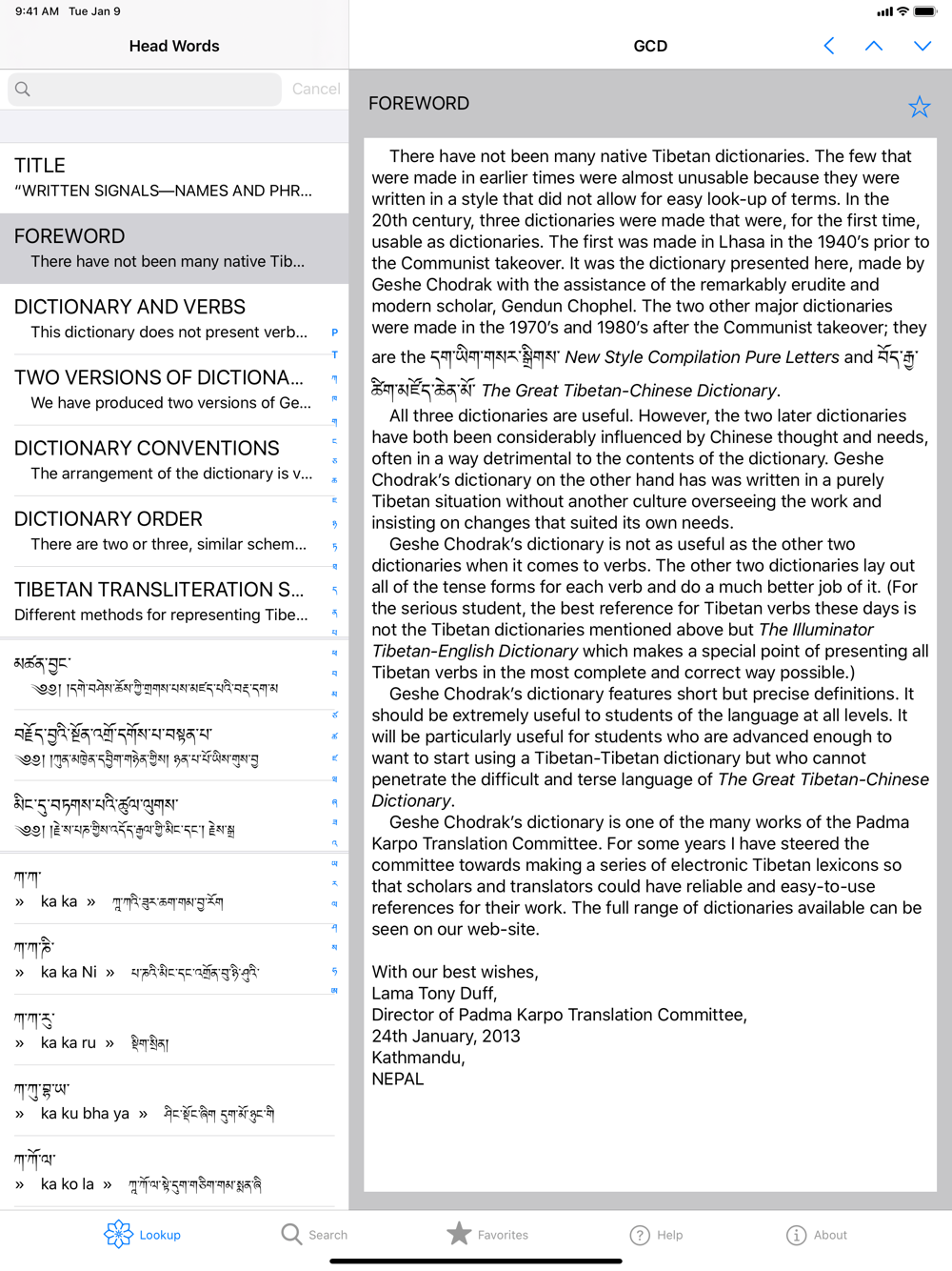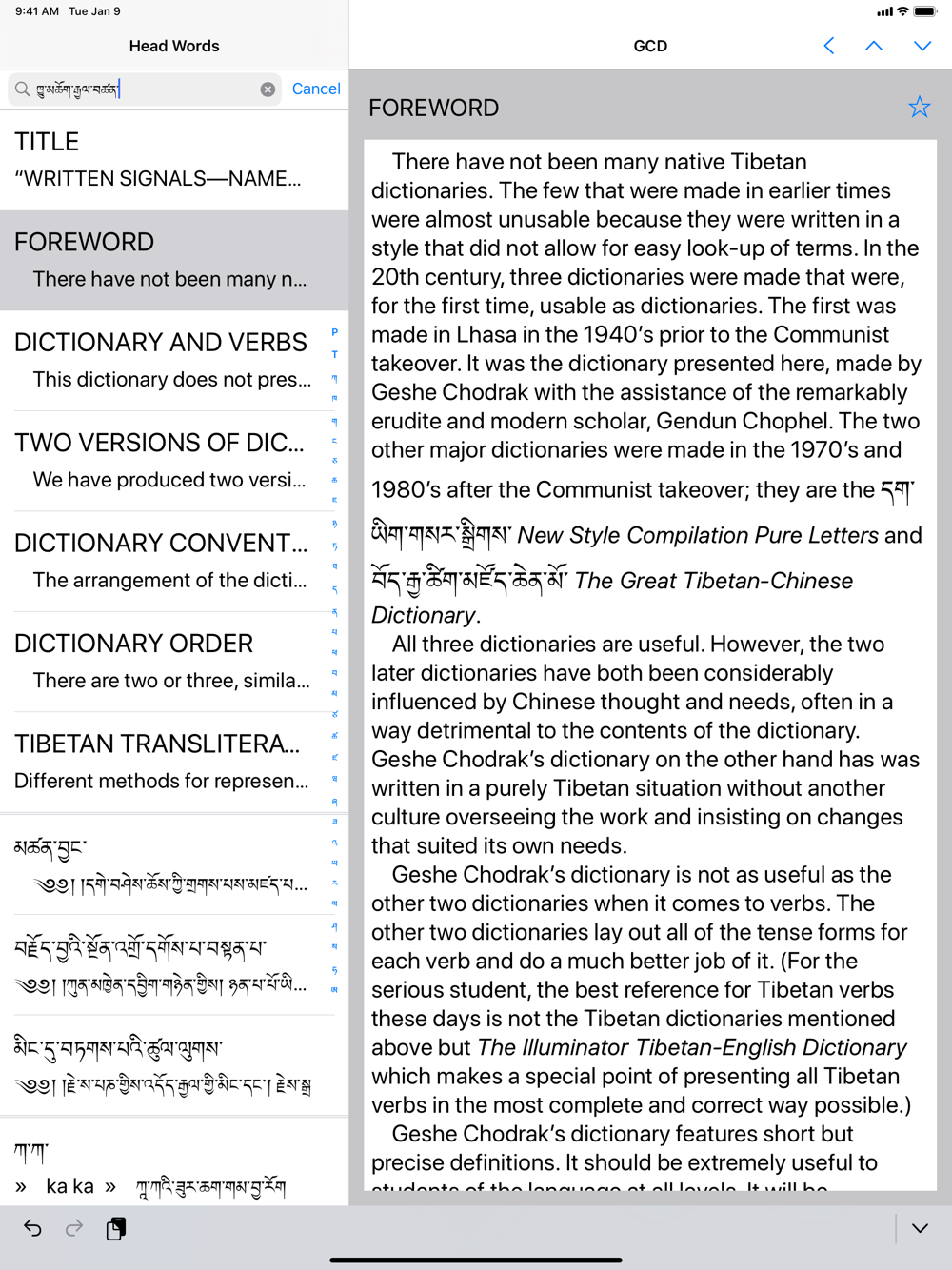 There have not been many native Tibetan dictionaries. The few that were made in earlier times were almost unusable because they were written in a style that did not allow for easy look-up of terms. In the 20th century, three dictionaries were made that were, for the first time, usable as dictionaries. The first was made in Lhasa in the 1940’s prior to the Communist takeover. It was the dictionary presented here, made by Geshe Chodrak with the assistance of the remarkably erudite and modern scholar, Gendun Chophel. The two other major dictionaries were made in the 1970’s and 1980’s after the Communist takeover; they are the dag yig gsar sgrigs New Style of Compilation Pure Letters and the bod rgya tshig mdzod chen mo The Great Chinese-Tibetan Dictionary. All three dictionaries are useful. However, the two later dictionaries have both been considerably influenced by Chinese thought and needs, often in a way detrimental to the contents of the dictionary. Geshe Chodrak’s dictionary on the other hand has was written in a purely Tibetan situation without another culture overseeing the work and insisting on changes that suited its own needs.