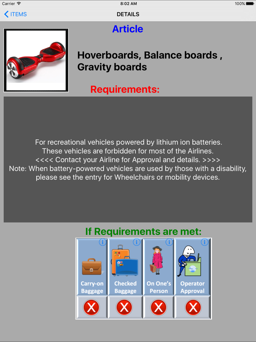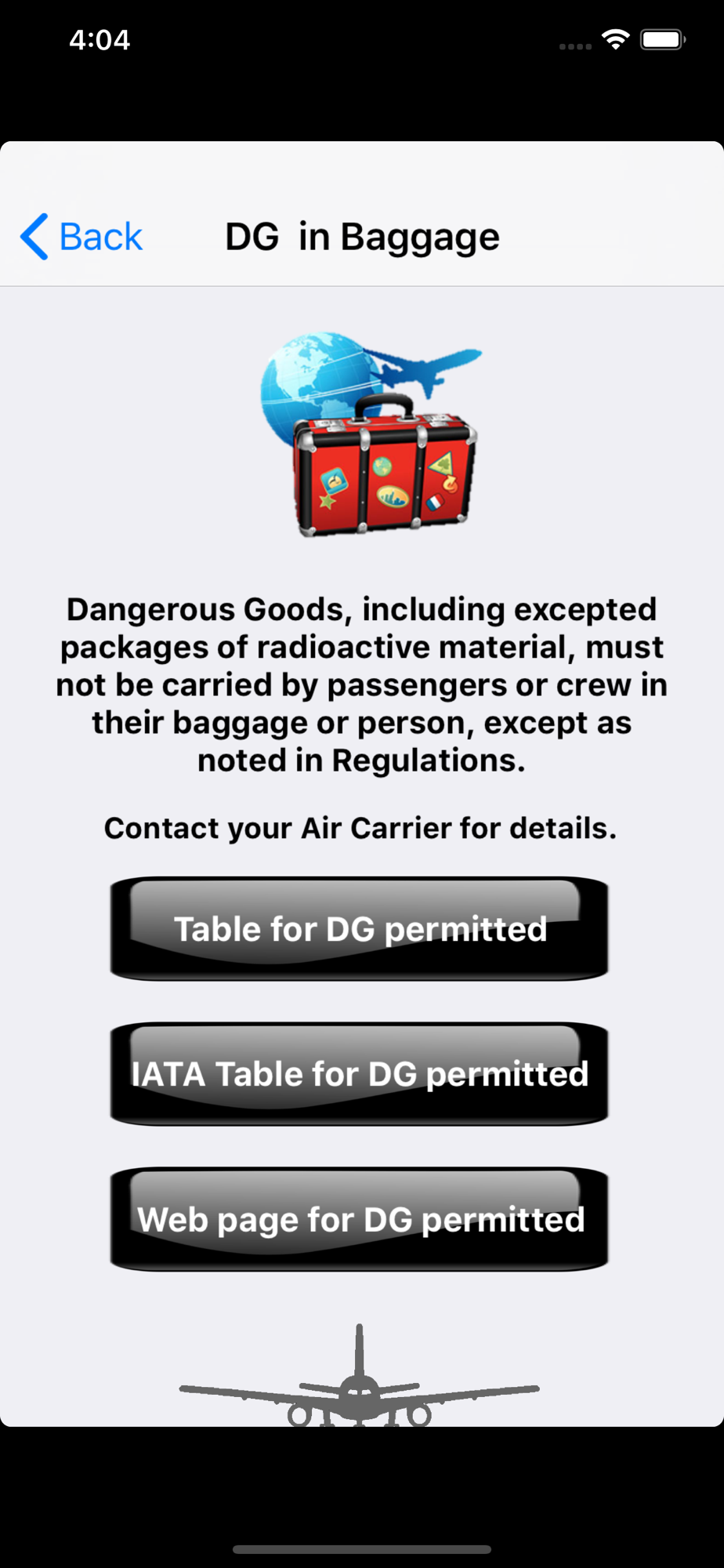 This application is designed to guide passengers about items or substances that are permitted in checked baggage, hand luggage or in a person when you go on a trip by plane.