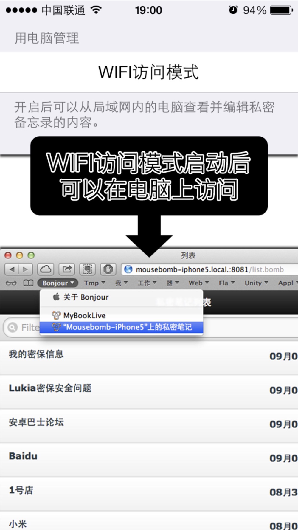 ■ 跨平台的WIFI访问模式,手机连到WIFI时可手动开启此模式,同一个局域网下的电脑或任何能够打开网页的设备(手机、平板等)上都可查看、编辑笔记(也要输入密码)。随时关闭iPhone上的App,资料又安全地锁在手机里。在办公室,随时调出记录;离开办公室,随时带着走。