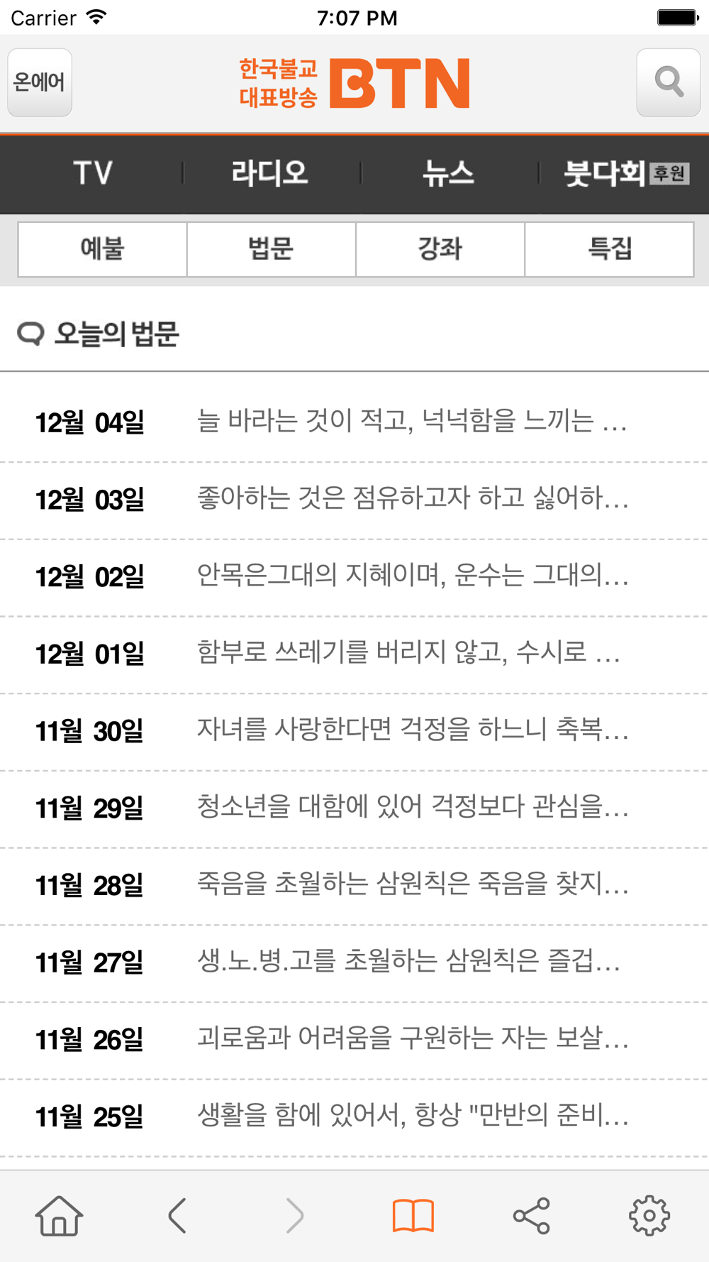 실시간 방송(LIVE)과 더불어 오늘의법문 예불,BTN뉴스,BTN소식,VOD(법문/강좌/교양)등 언제 어디서나 스마트폰으로 BTN불교TV를 시청하실 수 있습니다.