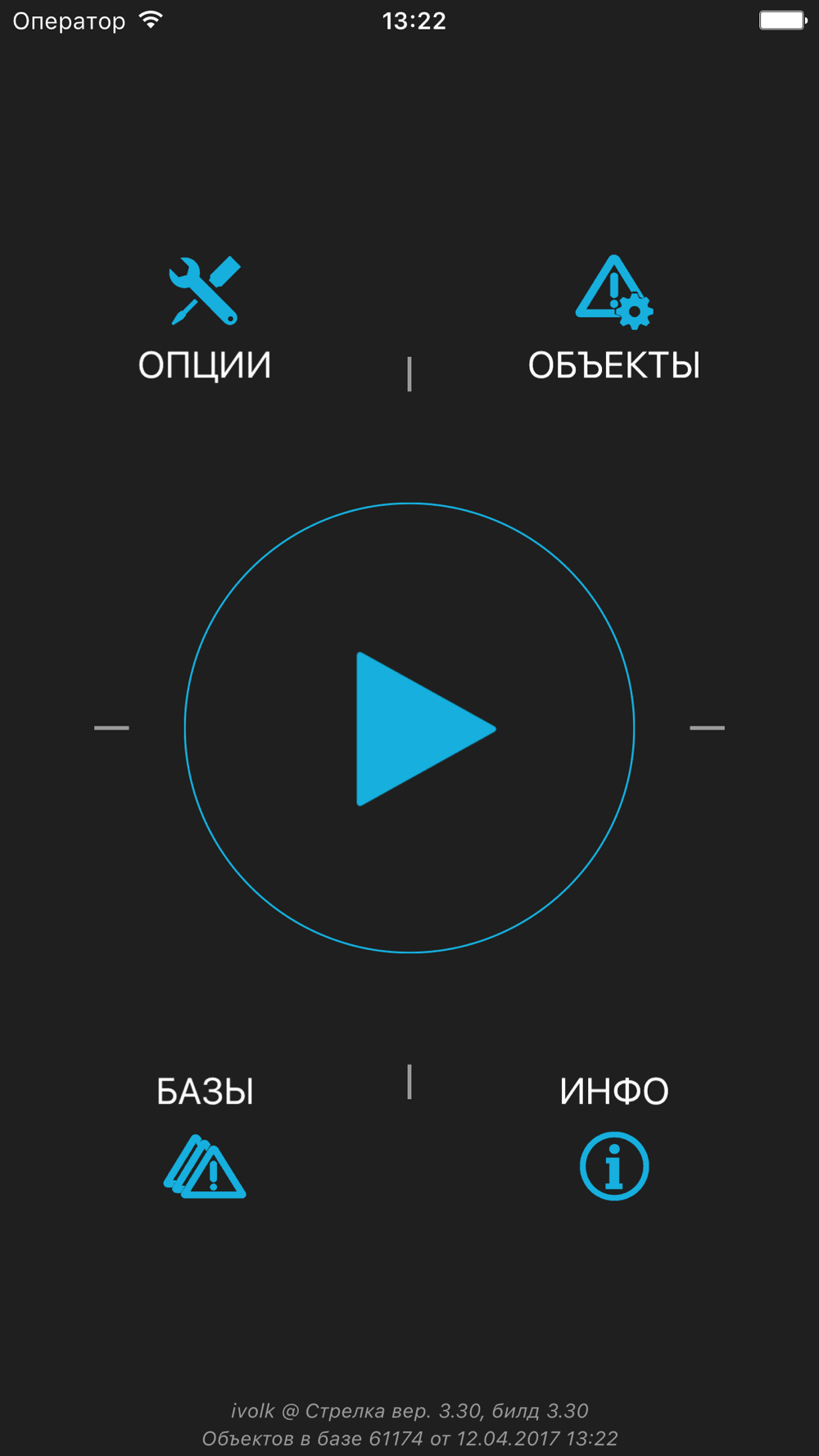 Запуск основного рабочего режима (режима обнаружения) осуществляется круглой кнопкой внизу (кнопка Старт). Что-либо увидеть вы сможете ТОЛЬКО начав движение. Дома и при скорости меньше минимальной, программа показывает только --.