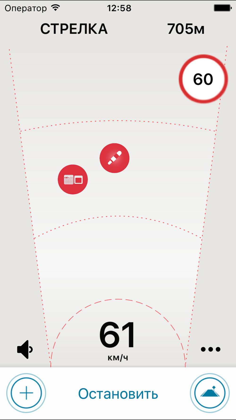 iStrelka отображает на экране объекты по ходу движения автомобиля, указывает тип, расстояние, вашу скорость и ограничение. Кроме этого выдает до трех звуковых и голосовых предупреждений об объекте по настроенным вами расстояниям. Также предупреждает вибрацией, бипером с изменяющейся частотой и через напоминания.
