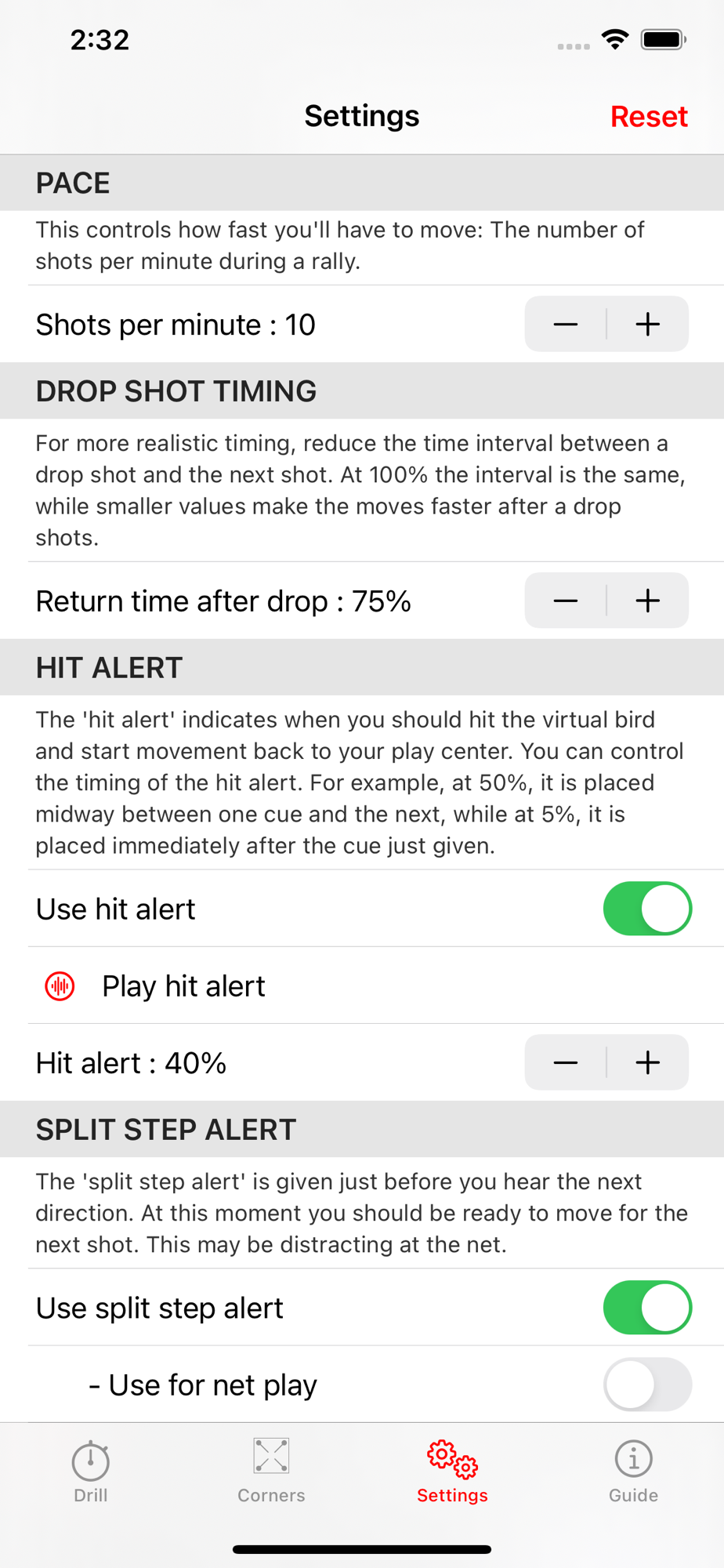 • Specify timing for a split-step alert to help guide your readiness for the next shot.