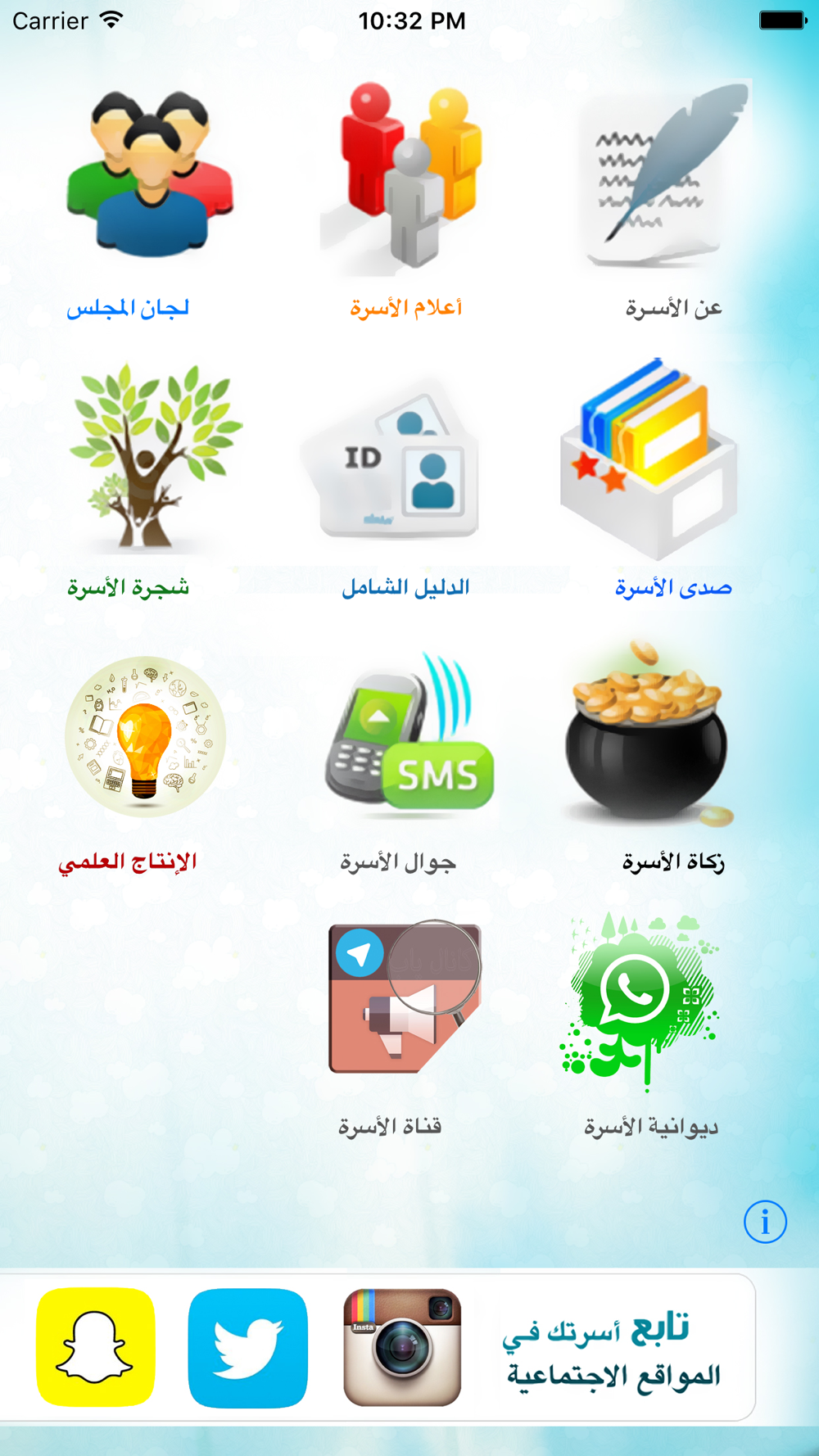 تجد في هذا التطبيق كل ما يهم الأسرة والباحث عنها كالنسب والشجرة وإصدارات مجلس الأسرة في الأعوام الماضية ، ومخرجاتهم العلمية والعملية ، وأعمال أبناء الأسرة التجارية ، وطرق التواصل في المواقع الاجتماعية ... الخ