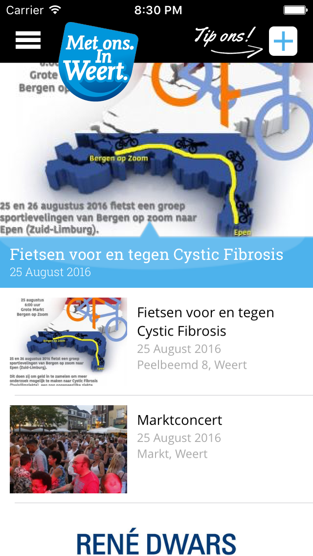 Verder vind je in de app de evenementen die de komende periode worden georganiseerd in Weert. De evenementenkalender is met medewerking van het platform MetOnsInWeert.nl tot stand gekomen.
